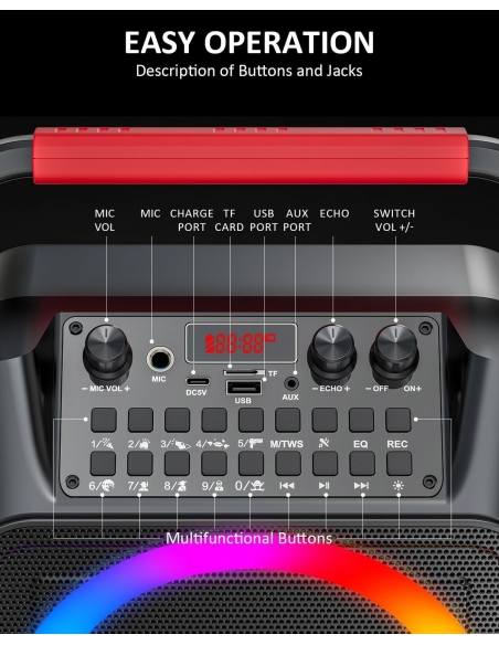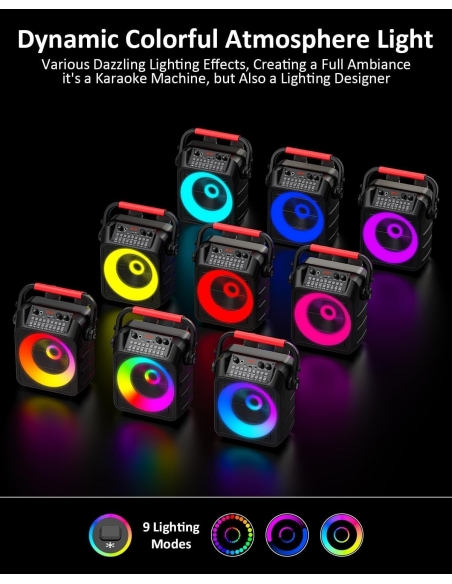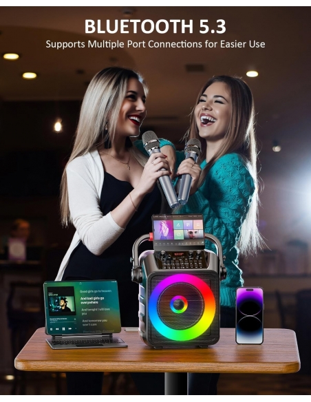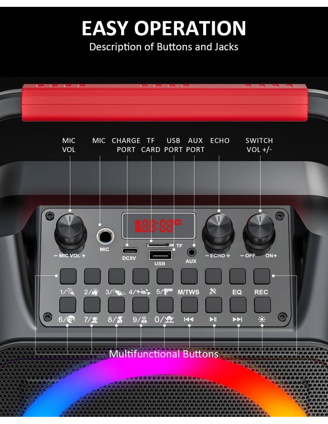 - karaoke bluetooth:Bluetooth 5.3 garantisce connettività instantanea e stabile. Pulsanti intuitivi, luci colorate dinamiche e supporto per Micro/TF, USB e AUX offrono massima versatilità d'uso.