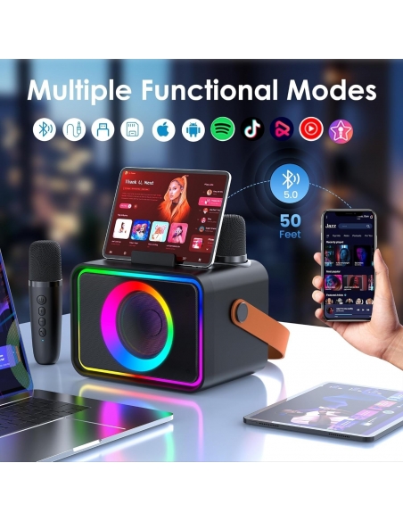 - 【Karaoke con microfono multifunzionale aggiornata】Questa cassa karaoke con 2 microfoni portatile con altoparlanti HD wireless Bluetooth da 8 W, il suono stereo a 360° offre un'esperienza audio ricca e coinvolgente. 2 microfoni wireless Bluetooth, pulsanti funzione separati, 2 slot di archiviazione per microfoni, in modo da non doverti preoccupare dei problemi di archiviazione del microfono, e questa macchina per karaoke supporta una scheda Micro TF, Flash USB e connettività AUX-in. Compatibile con il telefono cellulare Android. TV, iPad, tablet, PC Con Si dispone di un altoparlante, microfono, lettore e amplificatore per chitarra. Perfetto per feste, giochi, karaoke e riproduzione di film.