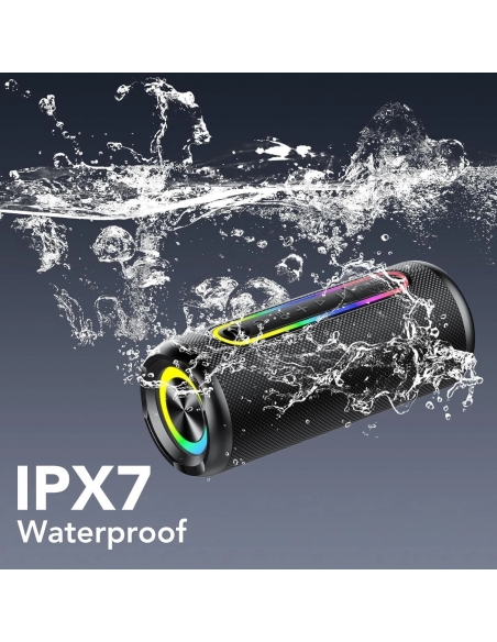 - Impermeabilità IPX7 e Portabilità Robusta: Il team di progettazione ha selezionato il materiale del guscio dell'altoparlante Bluetooth tra 78 tipi di materiali resistenti, rinforzato con 9 strati di lavorazione, rendendolo resistente anche a cadute da un'altezza di 5M. La sua eccellente tenuta gli conferisce una certificazione IPX7 di impermeabilità, permettendo all'speaker bluetooth di essere completamente immerso in acqua fino a 1,2M di profondità per 28 minuti.