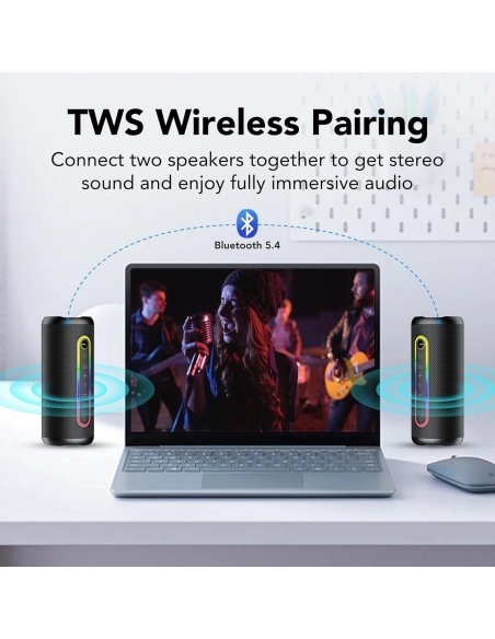 - 30 Ore Autonomia e Stereo TWS: L'cassa portatile è dotato di una batteria agli ioni di litio ricaricabile da 4000 mAh, che offre fino a 30 ore di riproduzione con una carica di 3 ore. Inoltre, è possibile disattivare le luci RGB per prolungare ulteriormente l'autonomia. Con la tecnologia TWS, collegando due cassa Bluetooth è possibile godere di un effetto audio surround simile al Dolby, come se ci si trovasse in un cinema privato.