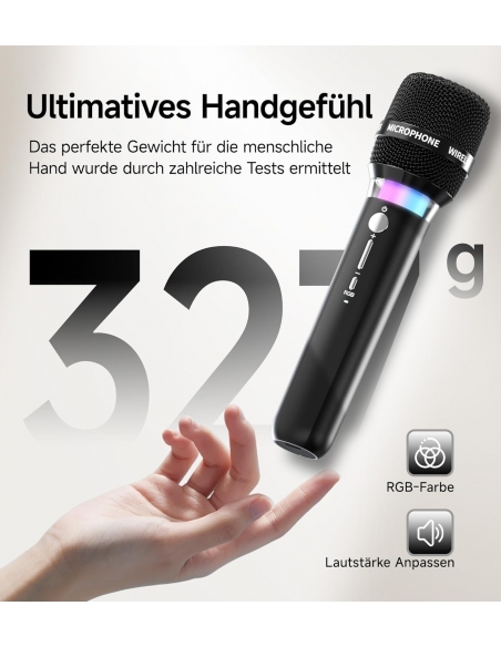 - 2 microfoni wireless con controlli separati: include due microfoni wireless professionali con microfoni in metallo e tecnologia anti-feedback. Ogni microfono ha un controllo del volume integrato e tre preset di illuminazione RGB (statico, breathing, gradiente). Il ricevitore da 6,35 mm/3,5 mm è compatibile con il 99% dei sistemi karaoke, mixer e altoparlanti.