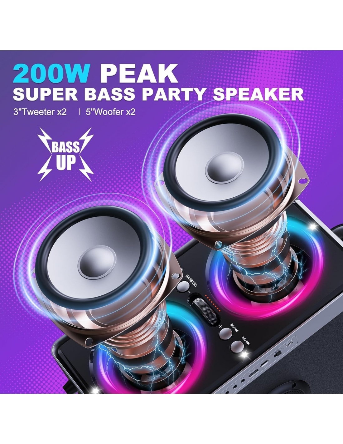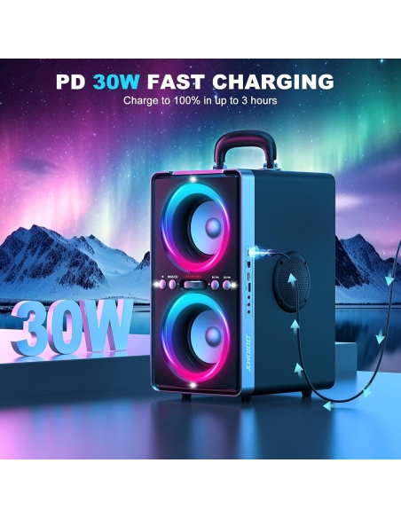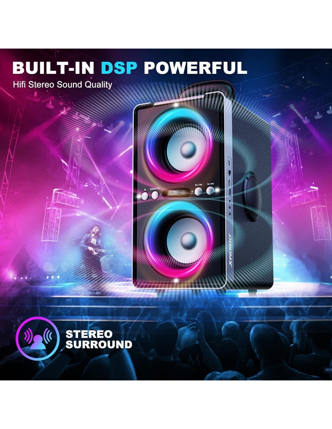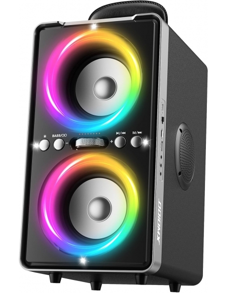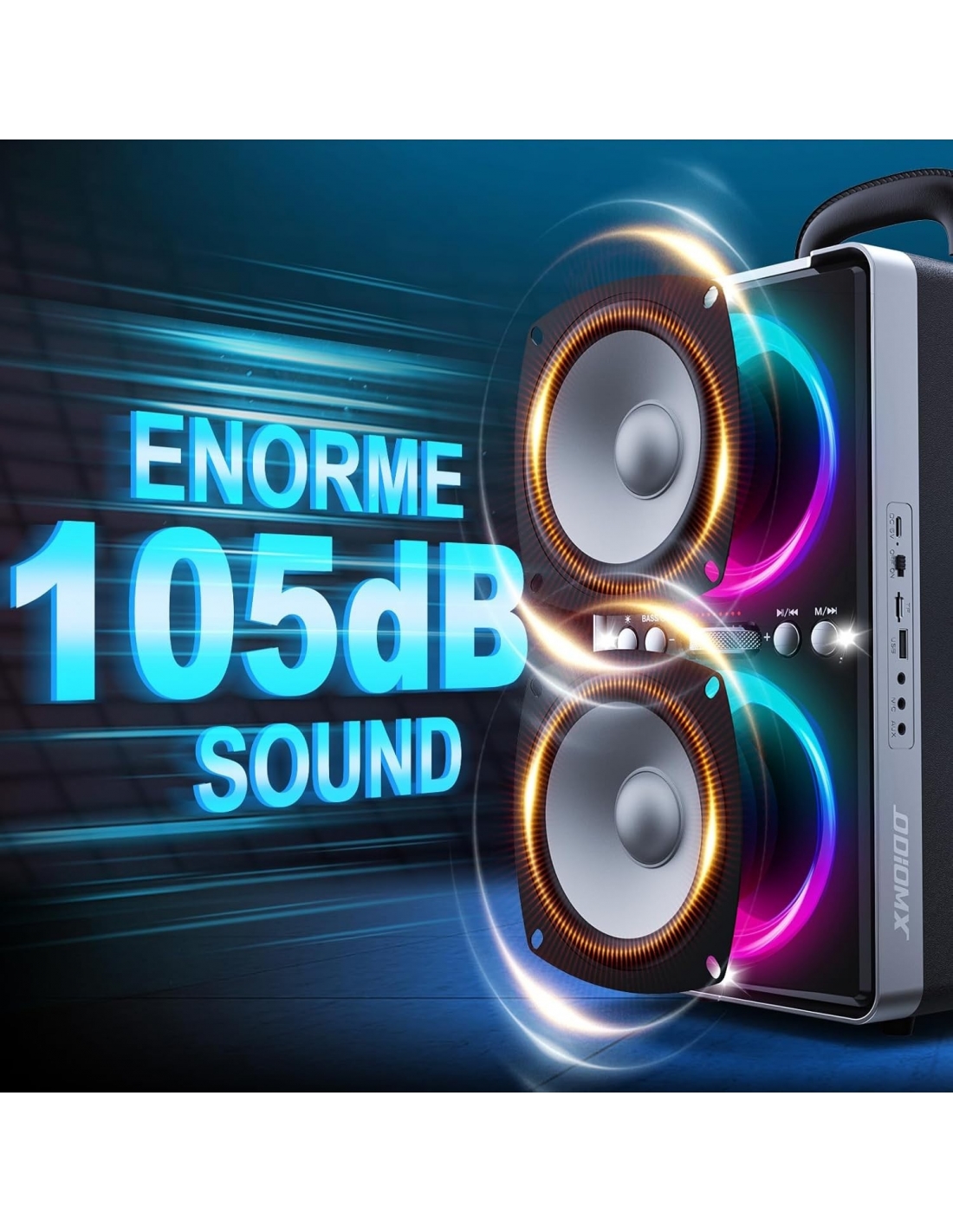 - 【Bassi ricchi ed esperienza sonora potente】Cassa Bluetooth Potente Portatile dimensioni ODIOMX offre un'impressionante potenza di picco di 200W e dispone di tubi bass reflex avanzati per bassi profondi e naturali. Premendo semplicemente il pulsante "Bass", l'altoparlante sprigiona un suono potente che riempie ogni festa con musica vivace. Che ti piaccia la musica o i film, potrai sperimentare una chiarezza e una profondità senza pari senza distorsioni a qualsiasi volume