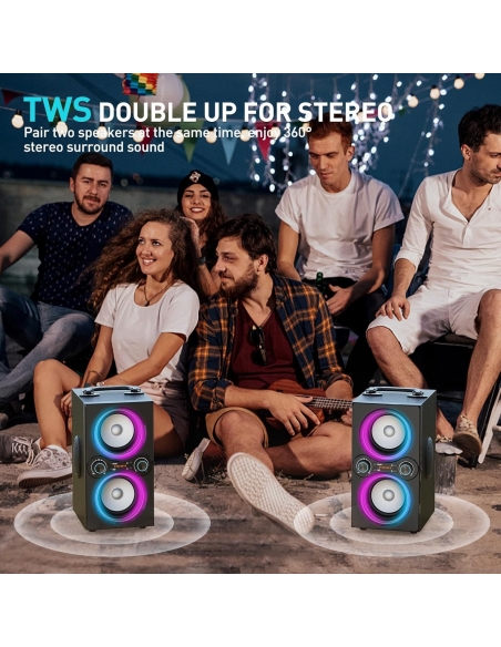 - 【 Associazione Stereo Wireless da 160W】TPBEAT casse bluetooth potenti has "TWS function" Connetti due altoparlanti in modalità wireless, premi il pulsante TWS e otterrai immediatamente un suono surround stereo da 160W, gli effetti di luce coordinati con la musica creano un'atmosfera di festa unica, immergiti nell'incredibile per creare un'atmosfera rilassata a casa o a una festa assicurati e goditi il doppio effetto del vedere e dell'udire, rendendo la tua festa ancora migliore.