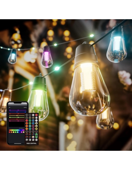 - Spettacolare luminosità RGB: Preparati per una festa visiva notturna senza pari con la nostra rivoluzionaria tecnologia RGB. Guarda come una gamma abbagliante di colori scorre non solo attraverso le 15 lampadine, ma anche lungo il cavo stesso, dando vita alla tua area esterna con tonalità vibranti e dinamiche.