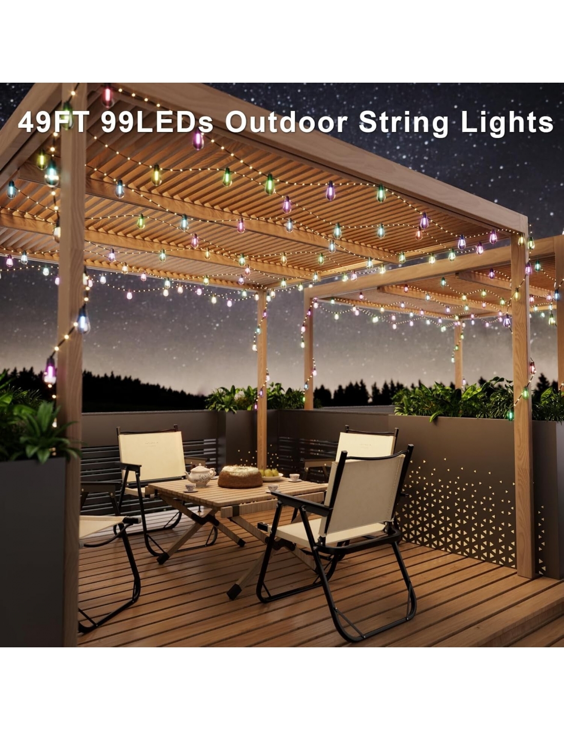 - Illuminazione elegante e sognante: potenziate con 99 LED RGB, le nostre luci a stringa distribuiscono la luce in modo uniforme su tutta la loro estensione di 48 piedi, con una distanza di soli 3 piedi tra le lampadine. Infondi nel tuo patio un'atmosfera romantica, perfetta per creare momenti preziosi con i tuoi cari.