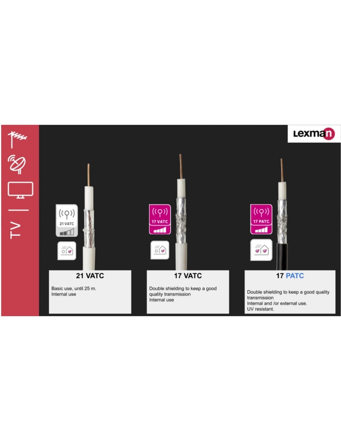 Il cavo TV Lexman 17 VATC garantisce un'eccellente qualità di trasmissione delle immagini sul tuo televisore. La tripla schermatura del cavo garantisce un'ottima protezione dai disturbi esterni. Collegato a una presa TV/antenna a muro, il cavo 17 VATC consente di creare la rete TV in casa. È progettato per essere installato all'interno delle pareti della casa
