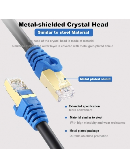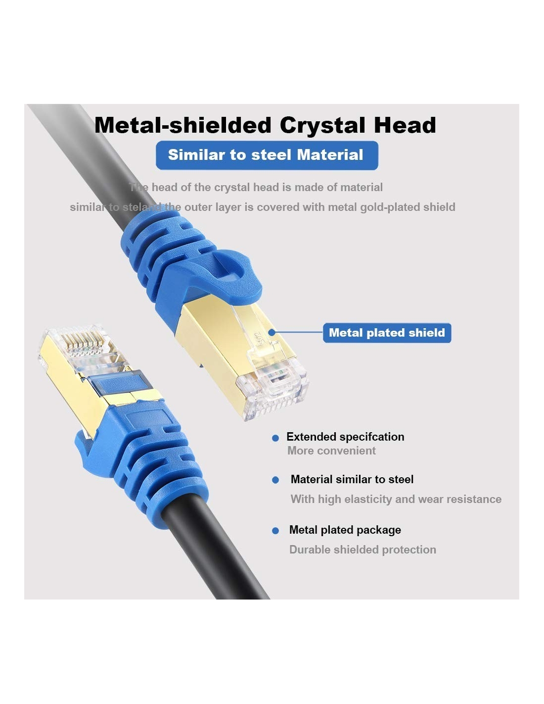 - Realizzati con 4 coppie di fili di rame OFC a filatura AWG a filamento con due connettori RJ45 placcati in oro su ciascuna estremità. - Ogni coppia intrecciata è protetta con doppio scudo della treccia in alluminio in alluminio in alluminio. 50 micron Pin di contatto placcati in oro in ciascun connettore.