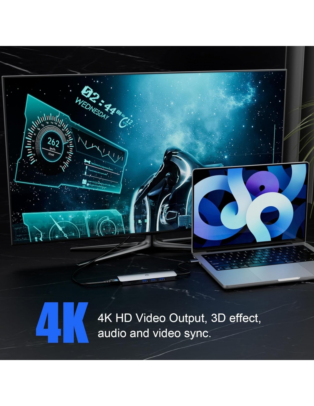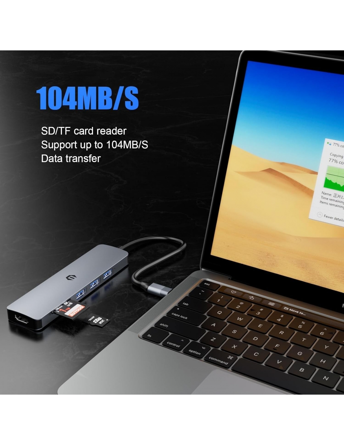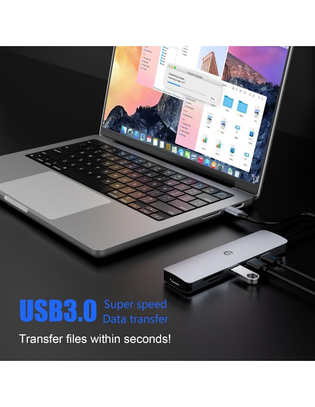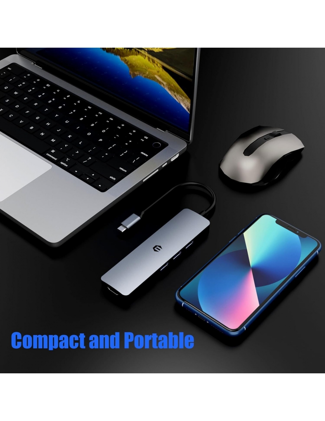 Hub USB versatile 6 in 1: questo dock USB C espande le capacità del tuo dispositivo con 1 uscita video esterna tramite HDMI 4K a 30 Hz, 3 porte USB A 3.0 per il trasferimento dati e lettori di schede SD/TF universali. Progettato per facilità d'uso, basta collegarlo e riprodurlo senza driver esterni. Questo adattatore compatto aggiorna facilmente il tuo laptop, tablet o smartphone per connetterti con più periferiche.
