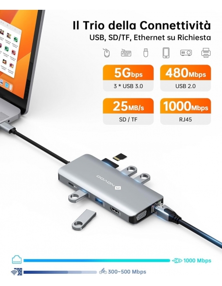 NOVOO R11 Docking Station USB C 11 in 1 Hub USB C Adattatore multiporta USB C Hub con 4K 60Hz HDMI 4 porte dati USB-A SD/TF Ethernet 1 Gbps VGA 3,5 mm