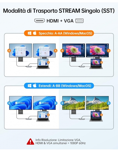 - Espandi le tue capacità di visualizzazione con la modalità SST su questa docking station per laptop. Consente configurazioni versatili dello schermo, migliorando la produttività e la facilità di condivisione dei contenuti durante riunioni o presentazioni