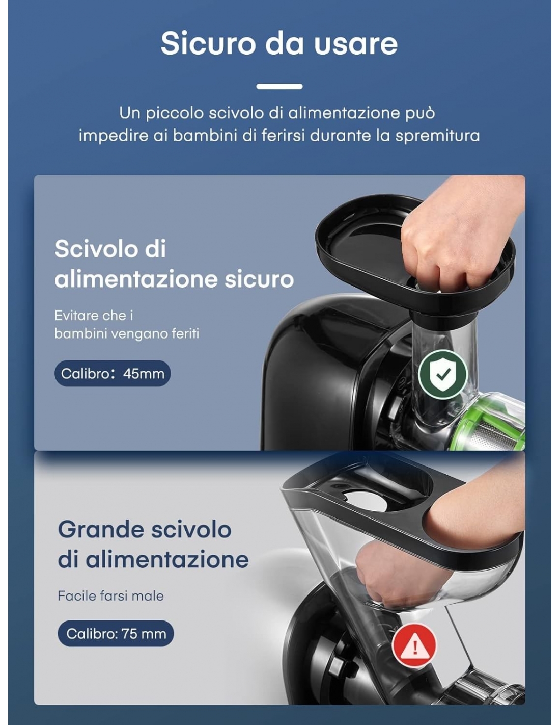 - 🍏【Spremiagrumi lento di piccolo calibro】 Il nostro estrattore di succo ha uno sportello piccolo per garantire la sicurezza durante l'estrazione degli alimenti intorno ai bambini. Raccomandiamo ingredienti non più grandi di 3,93 pollici per garantire un'operazione fluida. Il vassoio per alimenti attaccato al canale di alimentazione raccoglie la frutta caduta, rendendo l'estrazione del succo pulita e organizzata.