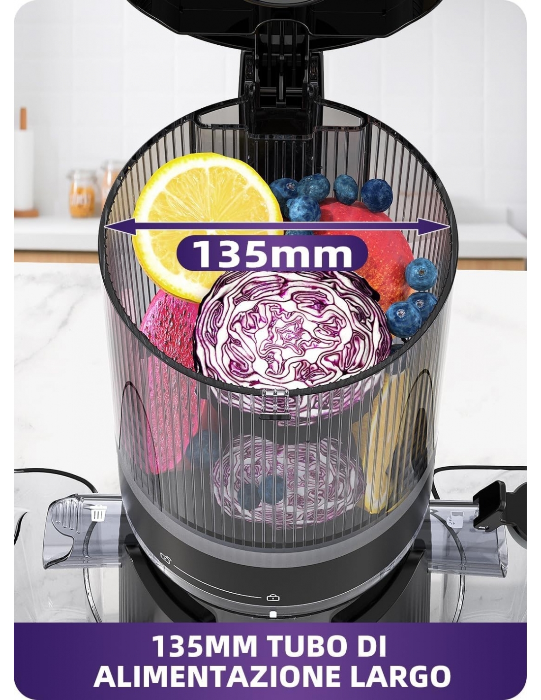 - 【Bocca Extra Large 135mm + Sistema Antiotstruzione Intelligente】Estrattore Frutta e Verdura Dotata di un'apertura di carico da 135mm, inserisci mele intere/carote SENZA TAGLIARLE! Motore potente da 300W con sistema di avanzamento automatico, estrazione fluida senza blocchi. Tasto di inversione intelligente risolve istantaneamente eventuali residui, efficienza raddoppiata.