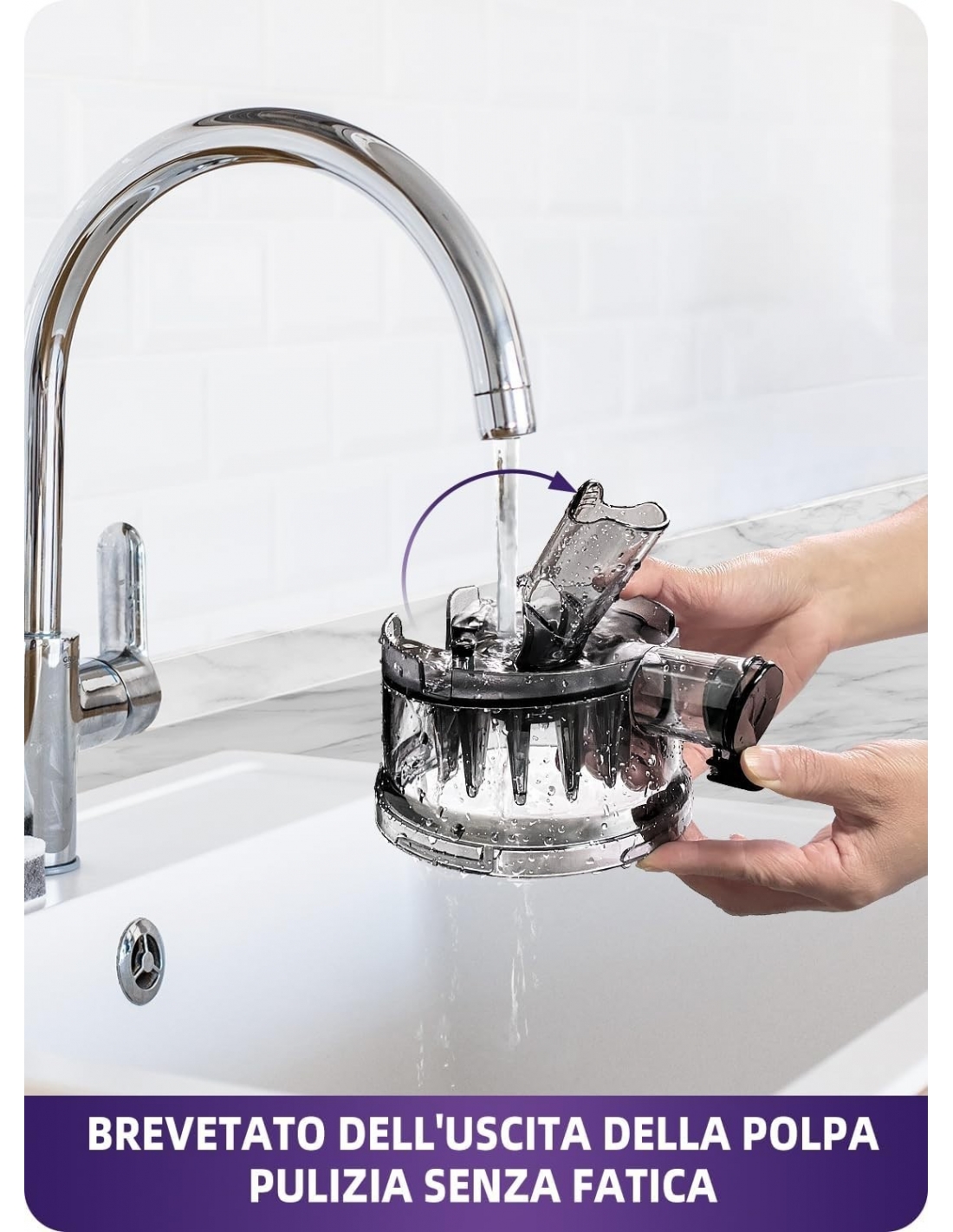 - 【Smontaggio in 15s + Design Brevettato Scarico Polpa 90°】Estrattore Struttura modulare con solo 3 componenti: smontaggio senza utensili, pulito in 30 secondi! Scarico polpa regolabile a 90° (brevetto esclusivo), residui eliminati senza accumuli. Filtro senza metalli + materiali BPA Free, componenti lavabili in lavastoviglie (escluso motore), tempo di pulizia ridotto del 70%.