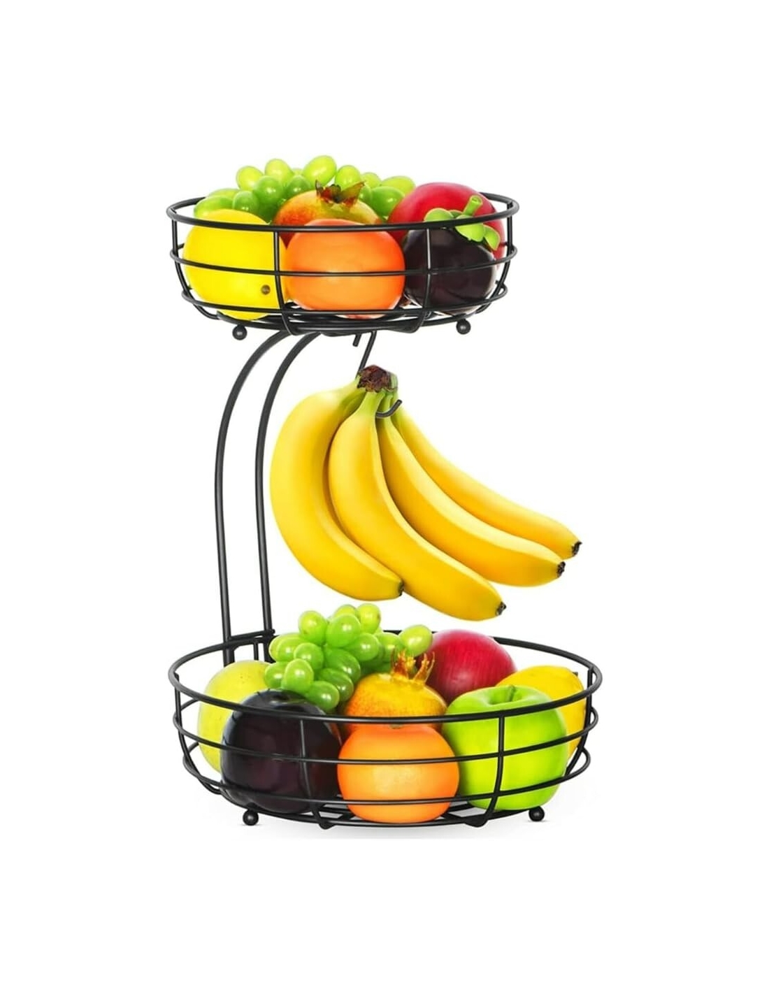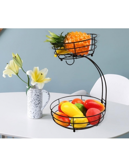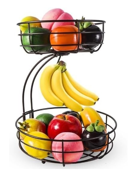 Cesto di frutta a due strati, banane, fragole, mele, pere, pesche.