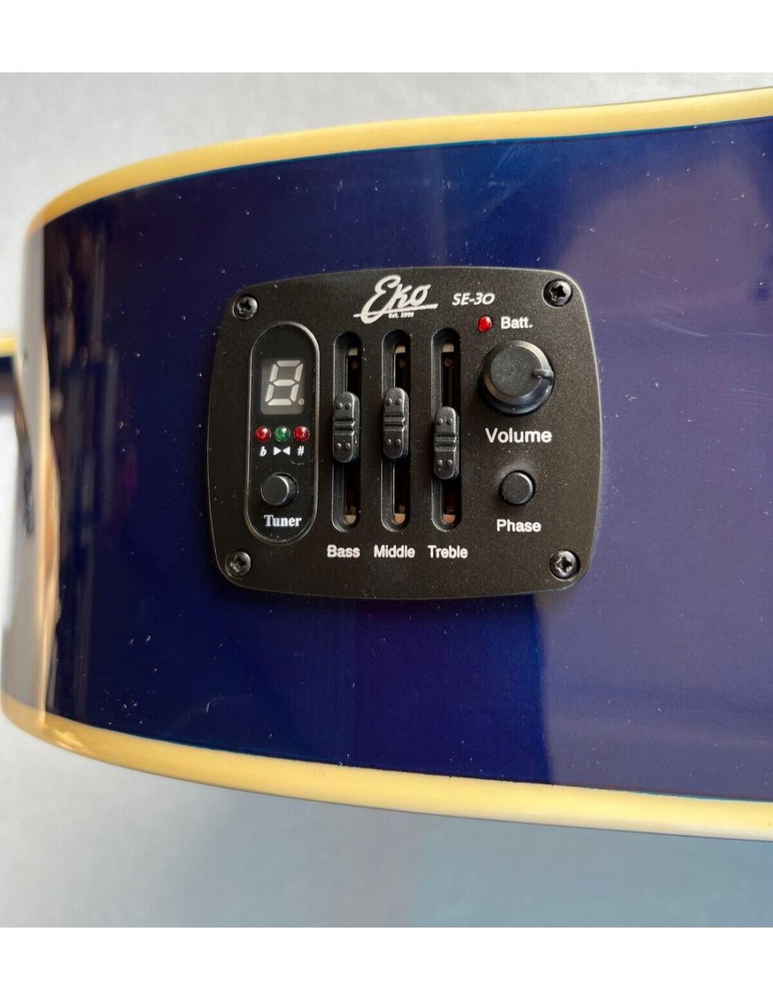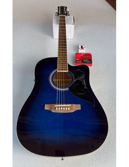 La Ranger CW EQ Blue Sunburst è la chitarra acustica elettrificata con forma Dreadnought spalla mancante di casa Eko Guitars, amplificata con sistema Eko SE30. Si presenta con Top in Abete, fasce e fondo in Linden, manico in Okoumè e tastiera in South American Roupanà. Una chitarra acustica dal costo contenuto, perfetta per un utilizzo live, per gli studenti e per chi decide di iniziare lo studio della chitarra con uno strumento affidabile e performante.