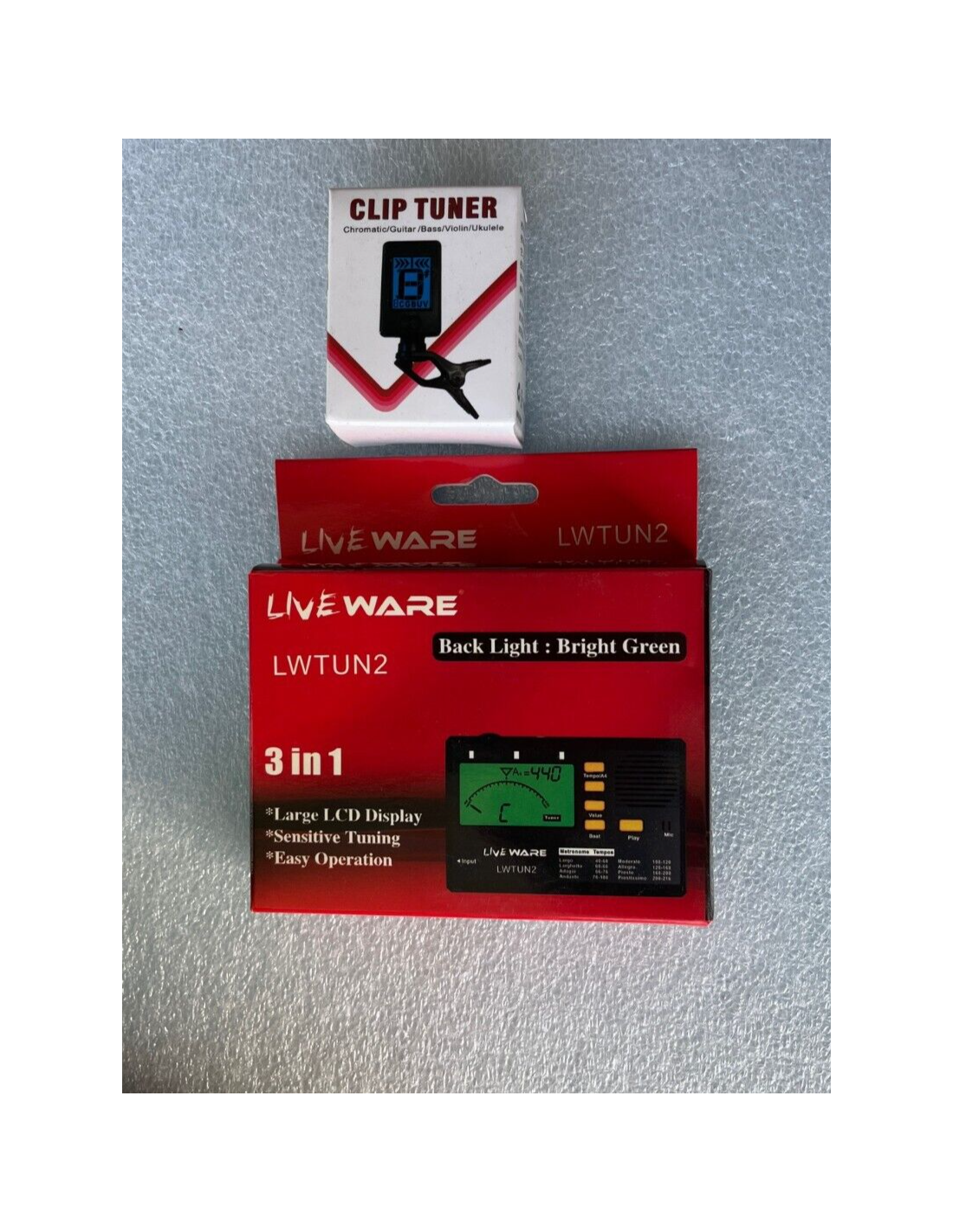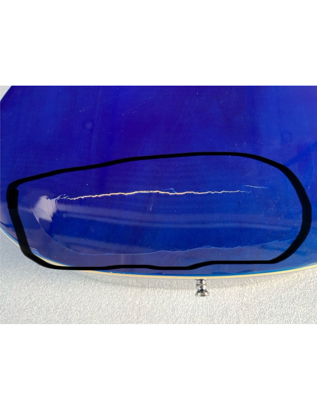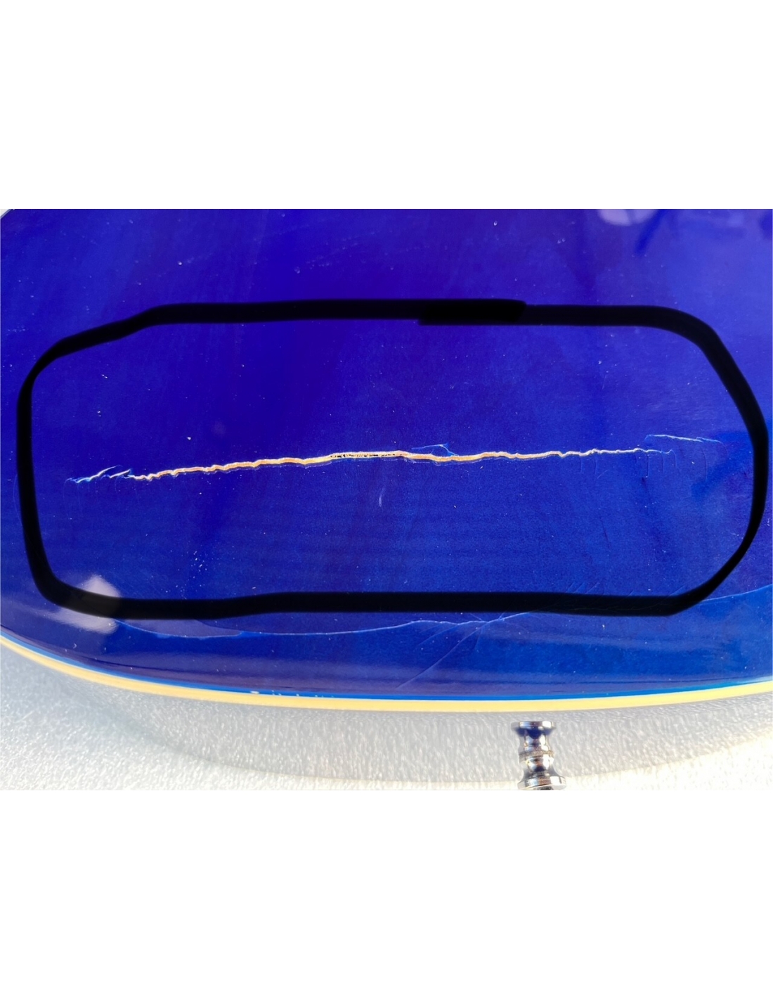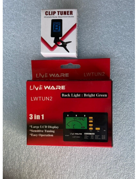 La chitarra ha una leggera spaccatura sul fondo e viene fornita anche con 2 accordatori come da foto reali del prodotto.