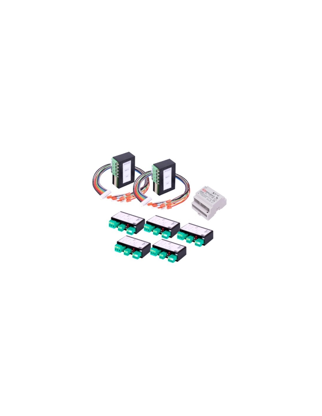 Il Kit Tapparelle consente di pilotare 5 tapparelle, tipicamente distribuite in varie stanze.Consente il pilotaggio locale di ogni singola tapparella ed inoltre, da due posizioni specifiche, 8 diversi scenari di apertura/chiusura. Il kit è costituito da:5 Moduli Controllo 1 tapparella 1071/43 - 2 Moduli 8 ingressi per pulsanti 1071/18 - 1 Alimentatore 1071/20