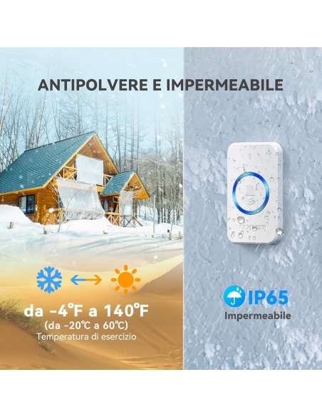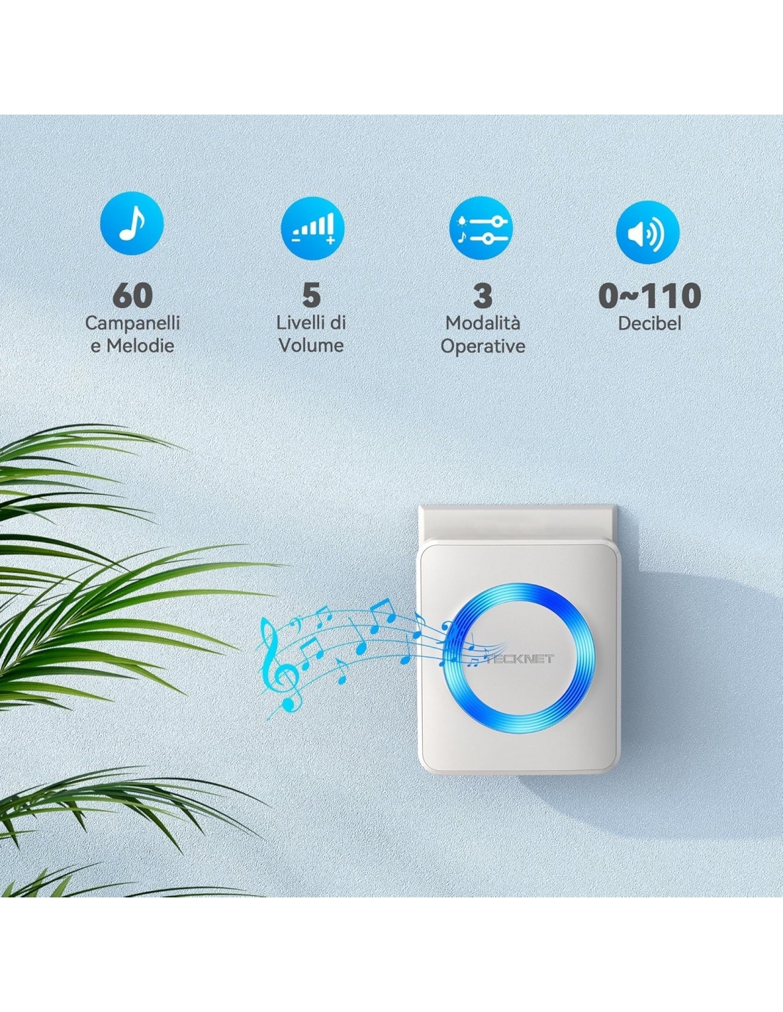- [60 suonerie e 5 opzioni di volume] Il campanello wireless ha 60 diverse bellissime melodie per soddisfare le tue diverse esigenze. Inoltre, il campanello ha 5 volumi regolabili, da 0 dB (silenzioso) a 110 dB, che possono essere regolati in qualsiasi momento in base alla situazione.