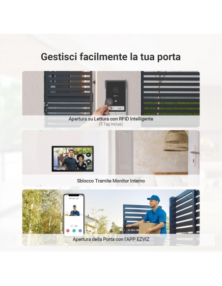 - 【3 Metodi di Apertura delle Porte】EZVIZ Intercom HP7 2-Family Kit fornisce un controllo degli accessi molto più semplice, aggiungendo una protezione visiva per verificare i visitatori. Può essere sbloccato tramite credenziali RFID (3 carte per ogni famiglia), dall'app remota e dal display interno.