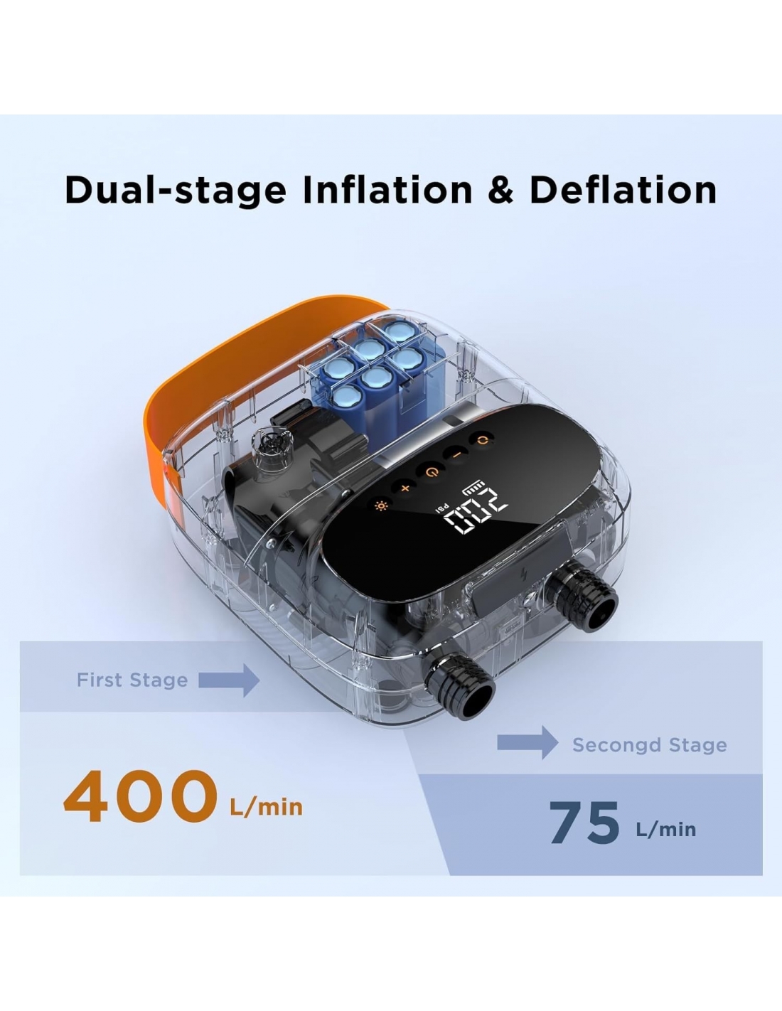 - 【SPEGNIMENTO AUTOMATICO E POMPA A DOPPIO STADIO】La pompa elettrica per paddle board è dotata di un motore a doppio stadio per un rapido gonfiaggio, con soli 7,5 minuti necessari per raggiungere 12 PSI o 9,5 minuti per 15 PSI (10,6 piedi): 1° stadio per la VELOCITÀ MASSIMA a 400 L/min e 2° stadio per la PRESSIONE MASSIMA a 75 L/min. La pompa si fermerà automaticamente quando raggiunge la pressione target, garantendo che il paddle board venga gonfiato in modo accurato e sicuro.