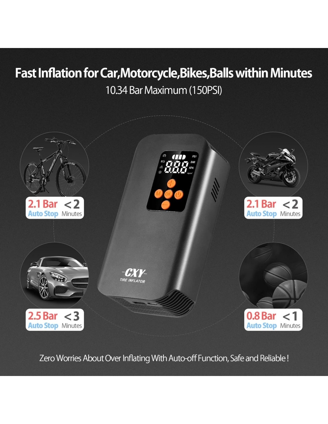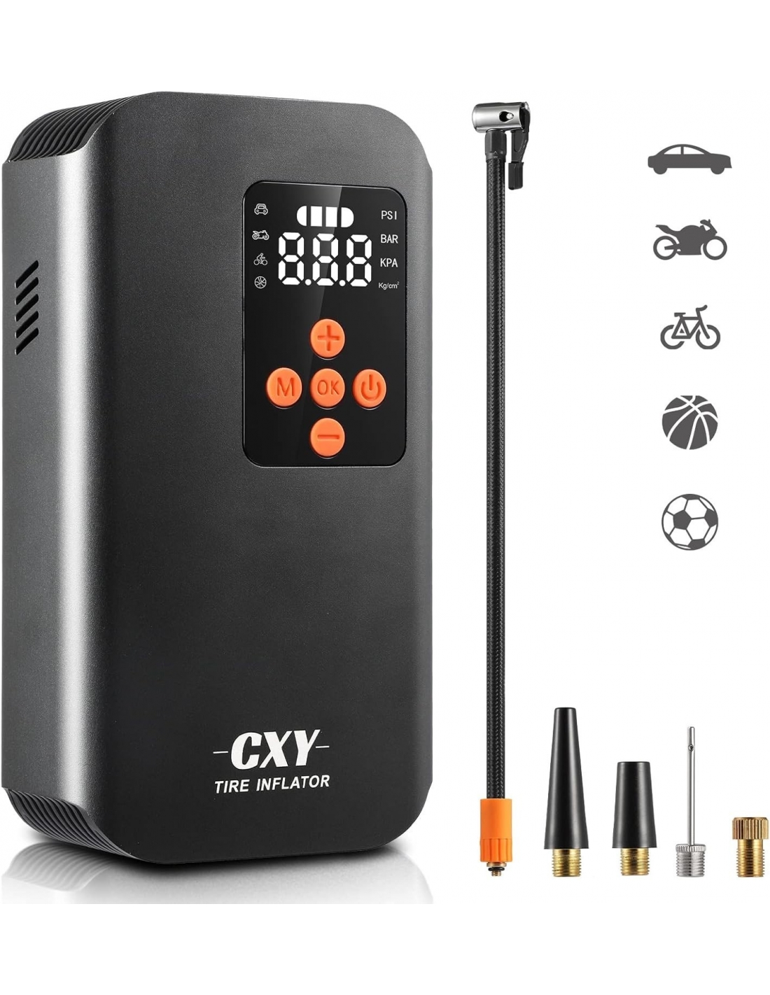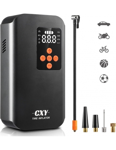 - 【Gonfiaggio Rapido per Auto, Moto, Bici, Palloni e Altro】Con 4 diversi ugelli ausiliari, il Cxy compressore aria portatile non solo l'auto, ma anche la moto, la bici, i palloni da calcio, il pallone da basket e l'anello da nuoto o altri gommoni. il mini compressore auto gonfia pneumatici dell'auto in 3 minuti, grX`azie alla pressione massima di 150 PSI, quelli della moto in meno di 2 minuti e quelli del pallone in 1 minuto.