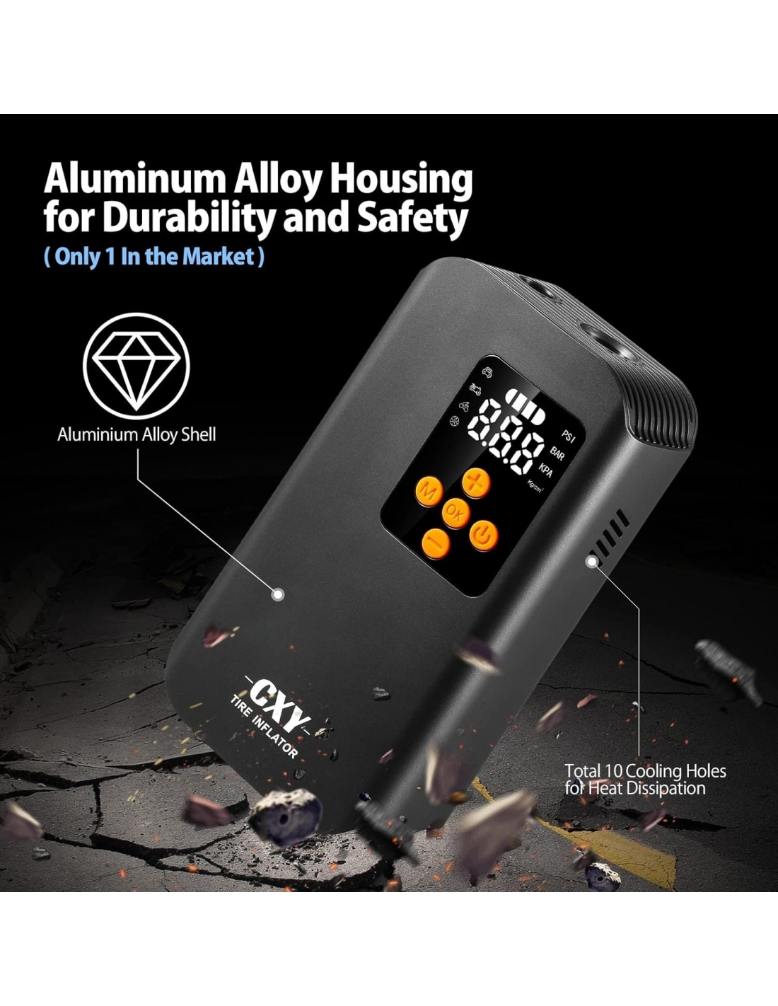 - 【Alloggiamento in Lega di Alluminio per Durata e Sicurezza (solo 1 sul mercato)】La mini compressore portatile per pneumatici è realizzata con un alloggiamento in lega di alluminio estremamente resistente, con 5 fori di raffreddamento e ventola di raffreddamento per una migliore dissipazione del calore e un'elevata durata. Cxy compressore auto sembra di lusso di fascia alta, più 6 tipi di sistema di protezione costruito all'interno per la sicurezza.