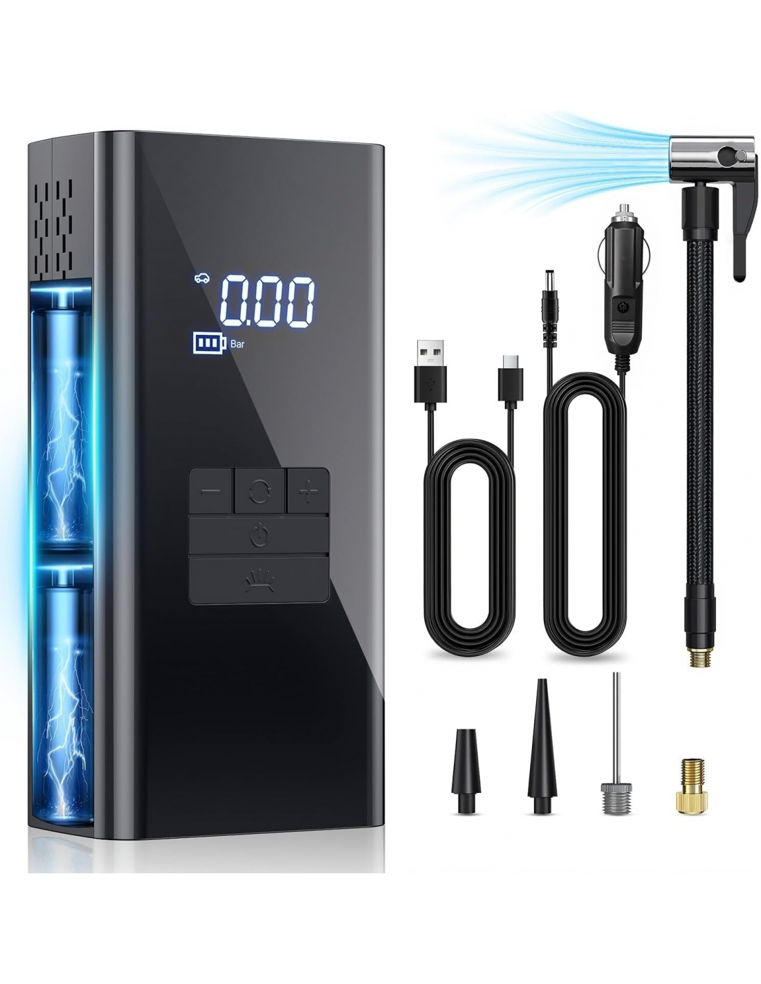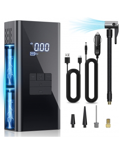 - Il compressore d'aria portatile per pneumatici include una pompa ad aria elettrica, un tubo dell'aria, quattro accessori, un cavo di ricarica USB, un cavo di ricarica per auto e una custodia. Questo compressore d'aria è ampiamente compatibile con auto di medie dimensioni, SUV, ATV, biciclette, moto, materassi ad aria, gommoni, palle e altro ancora. In caso di domande o preoccupazioni, non esitate a contattarci in qualsiasi momento. Per offrirvi prodotti di alta qualità e un servizio eccellente.