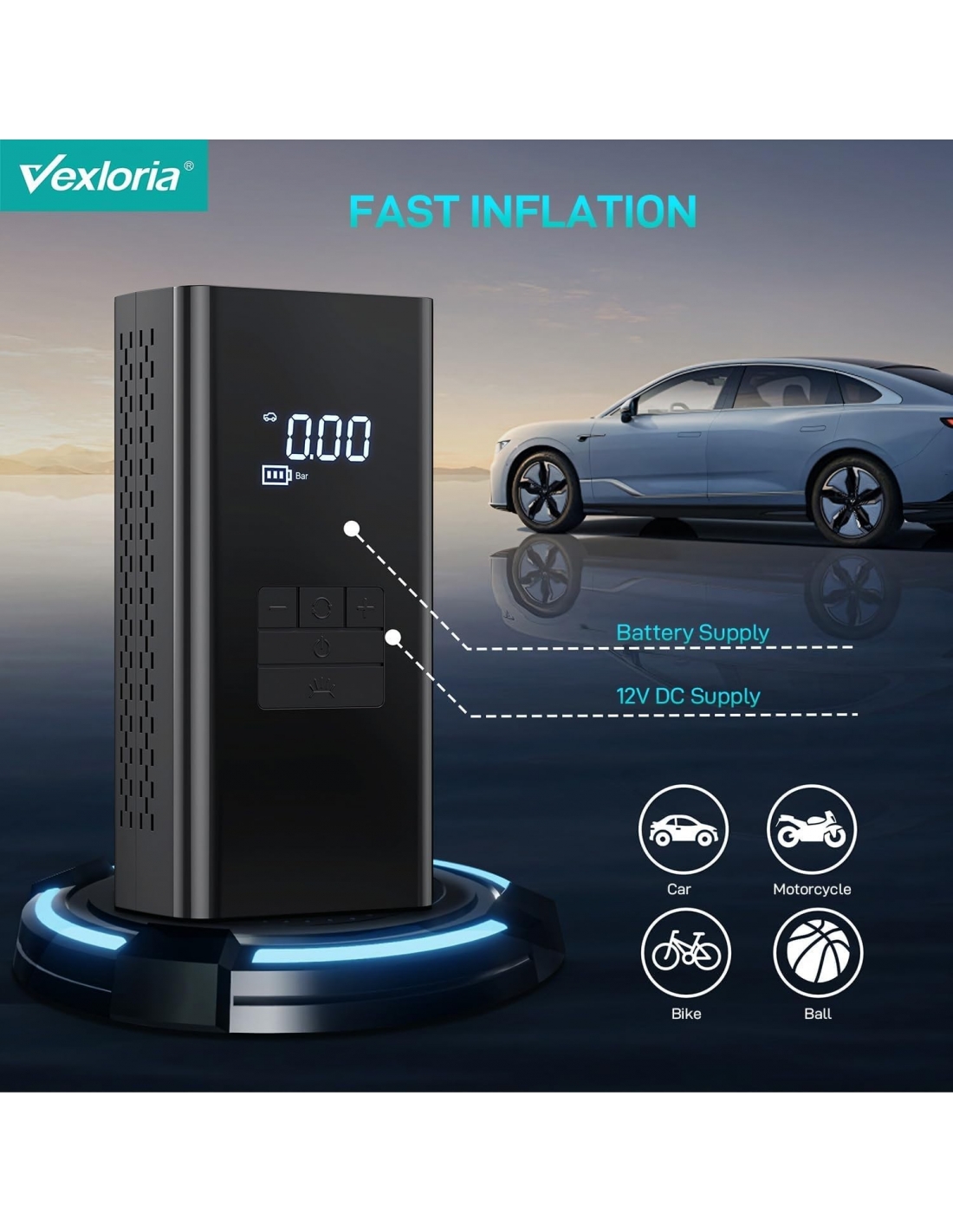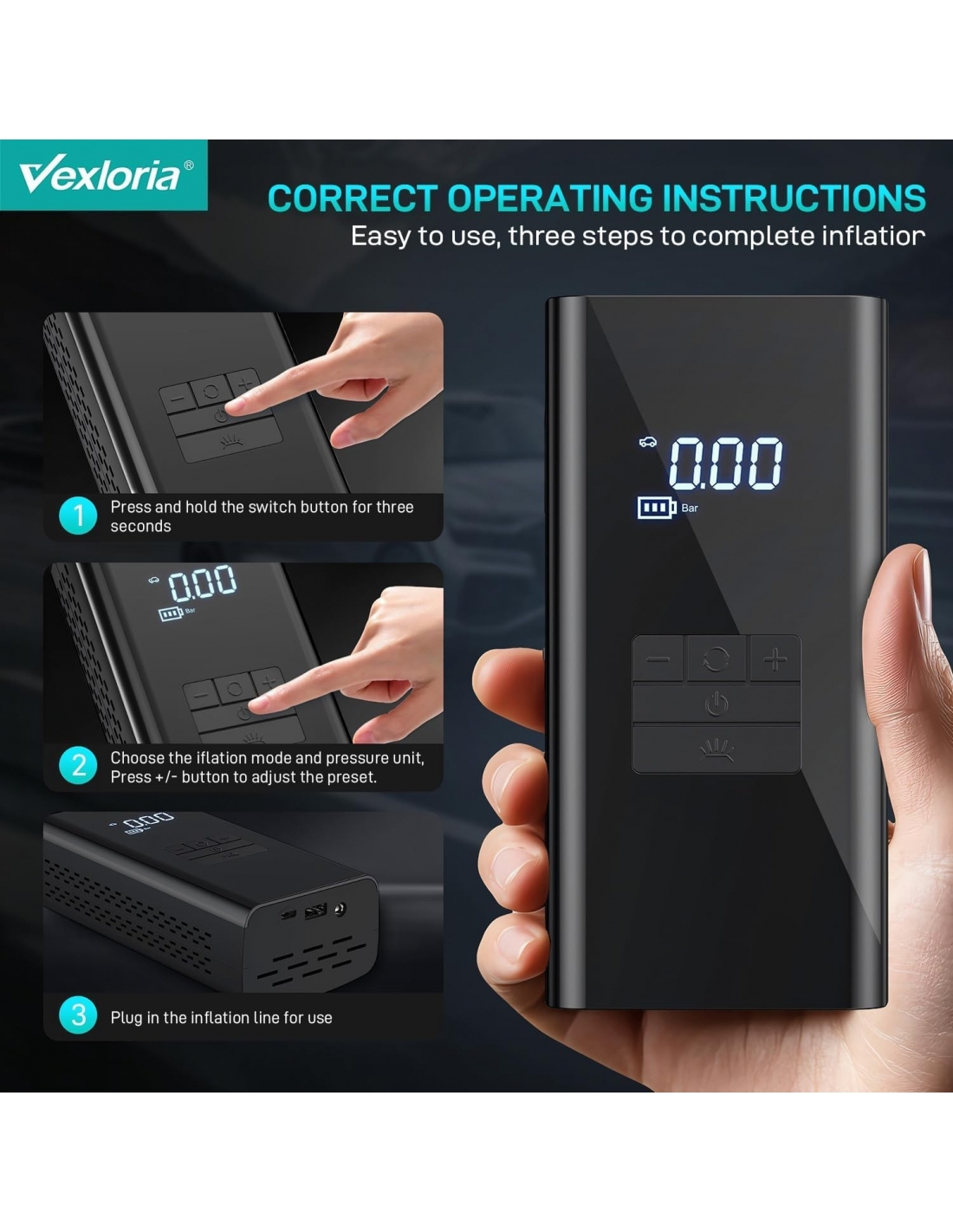 - Pompe ad aria intelligenti e sicure: con 4 modalità di gonfiaggio preimpostate (bicicletta, moto, auto e palla) è possibile cambiare rapidamente la pompa della bicicletta. Lo schermo LCD digitale della pompa ad aria a batteria mostra l'esatta pressione dei pneumatici e si spegne automaticamente quando viene raggiunta la pressione impostata per evitare sovraccarichi.