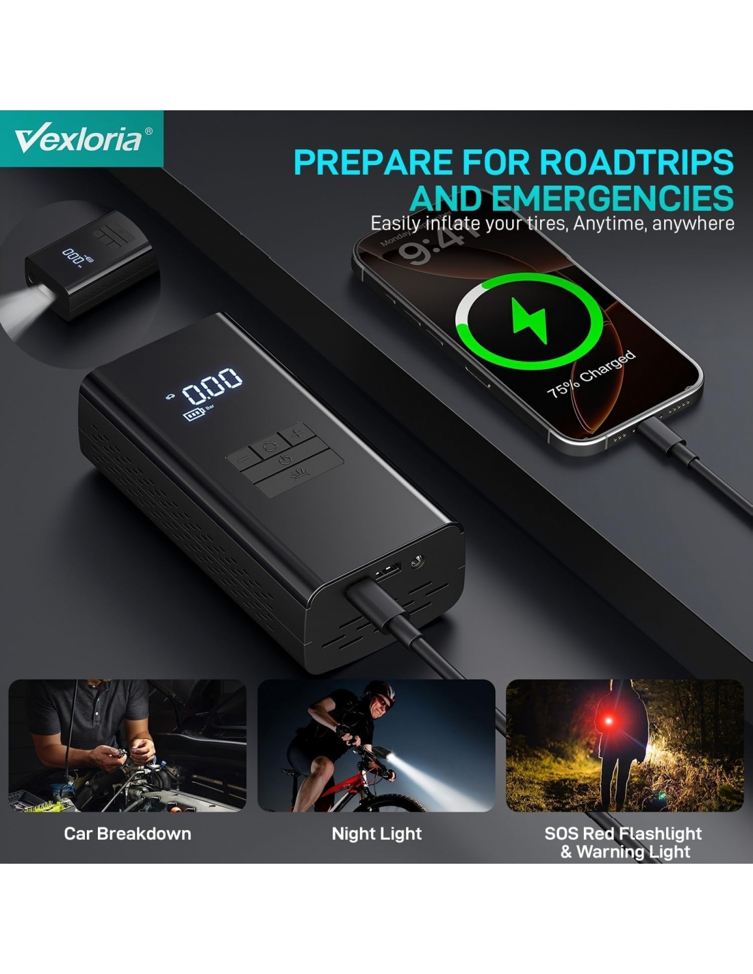- Questo compressore d'aria non è solo una pompa per pneumatici, ma anche una power bank con ingresso USB-C e uscita USB-A per ricaricare i dispositivi. Dispone inoltre di una luce di emergenza a LED con tre modalità: illuminazione, segnale di avvertimento e SOS, per facilitare il gonfiaggio e il cambio di pneumatici al buio.