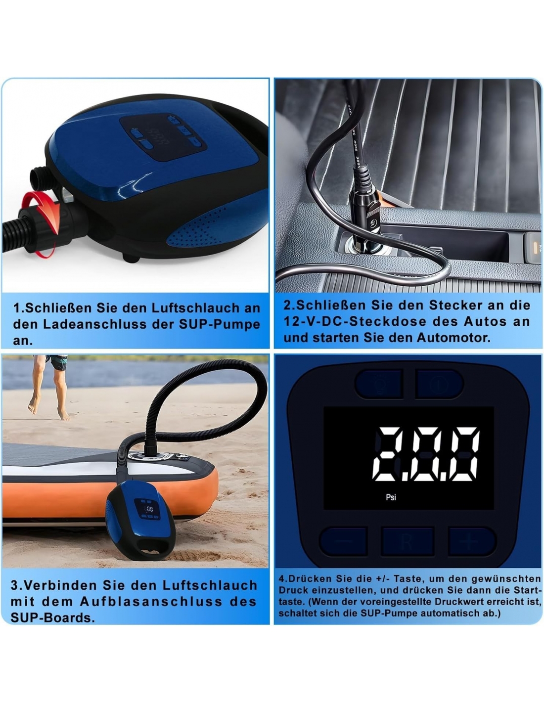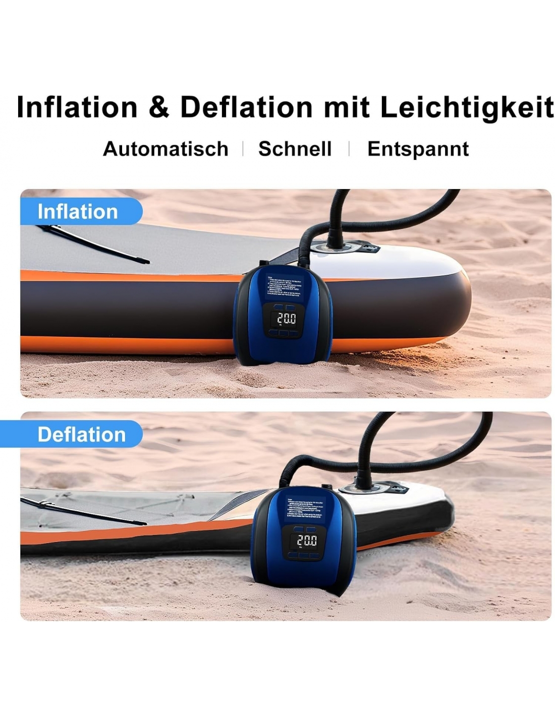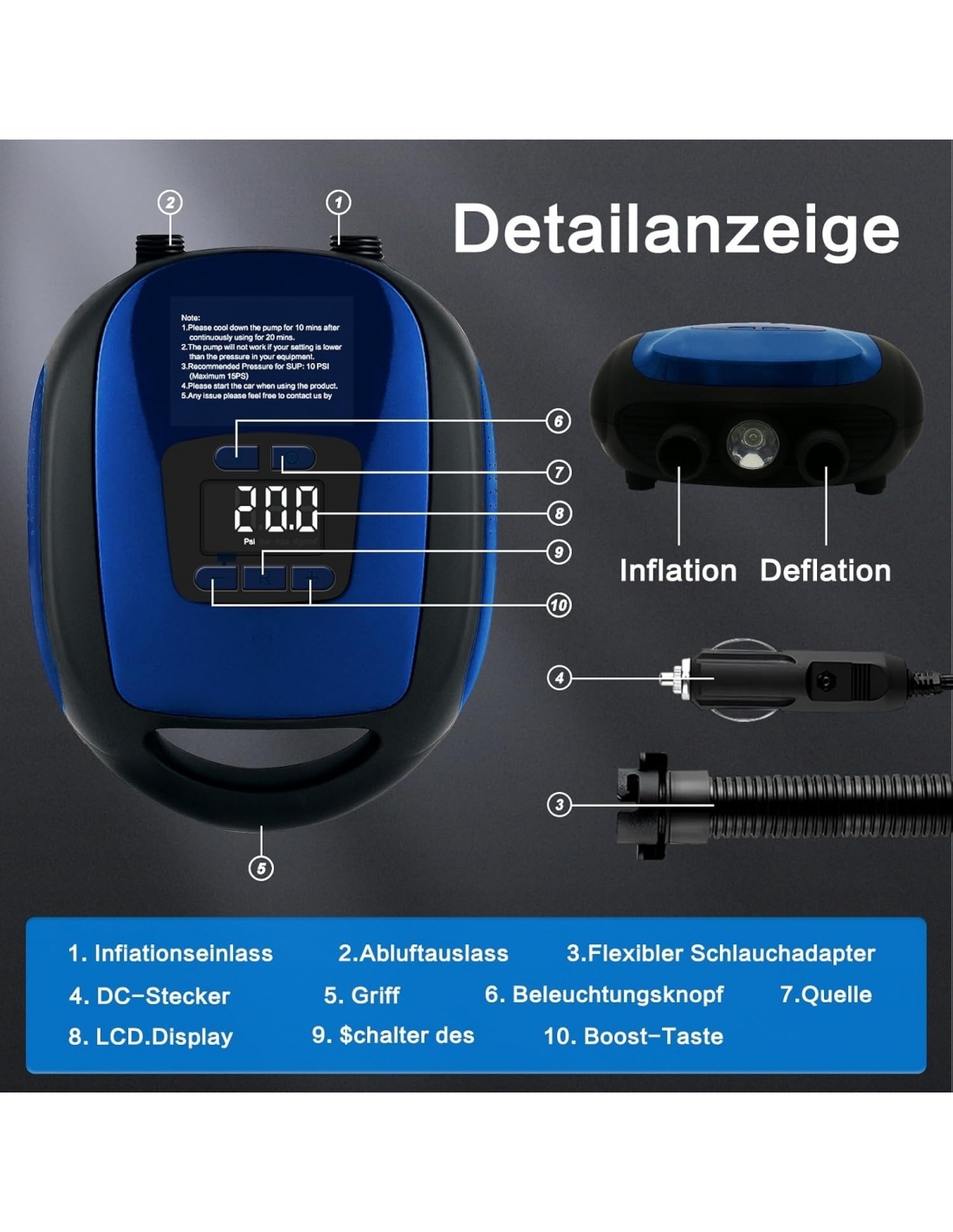 - Connettore per auto DC da 12 V: la pompa gonfiabile dispone di un fusibile da 15 A per una maggiore sicurezza. Veloce e facile da gonfiare il SUP (Stand Up Paddleboard) e i gommoni per sport acquatici in un batter d'occhio. Indipendentemente dall'uso quotidiano durante la stagione o occasionalmente durante l'anno