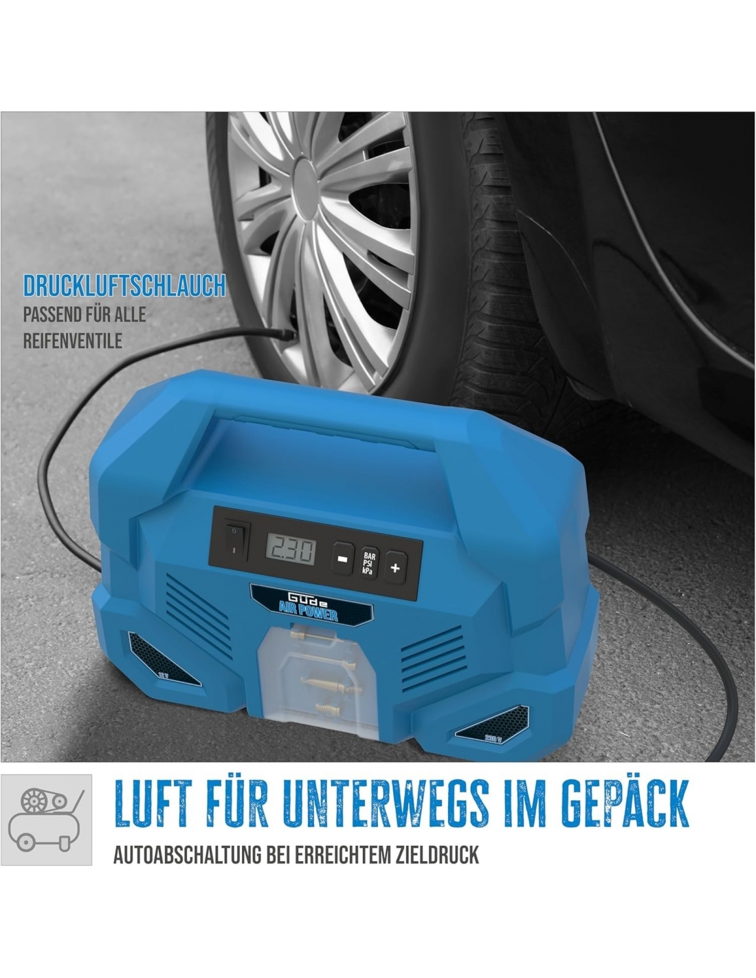 - Versatile: il compressore Güde Airpower Dual Drive 12/230 V/5 pezzi. È ideale per gonfiare pneumatici di auto, pneumatici per biciclette, materassi ad aria, palloni e molto altro ancora. Perfetto per l'uso a casa o in viaggio.