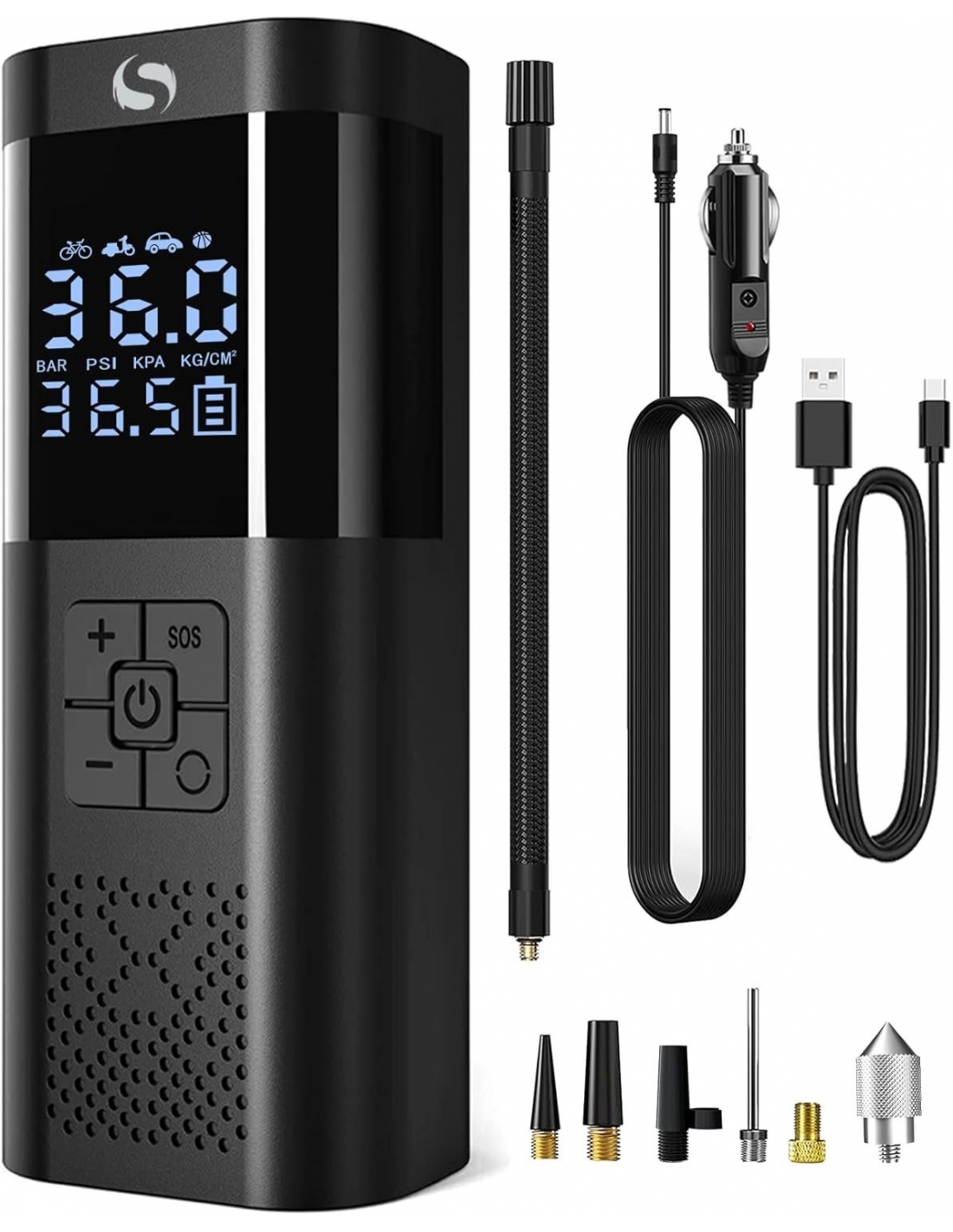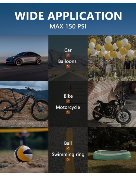 - MULTIFUNZIONALE: il compressore portatile per auto è dotato di 5 ugelli ausiliari extra per diverse esigenze di gonfiaggio. Il compressore auto non solo può gonfiare vari veicoli come moto e biciclette, ma anche palloncini, anelli da nuoto e altri oggetti gonfiabili.