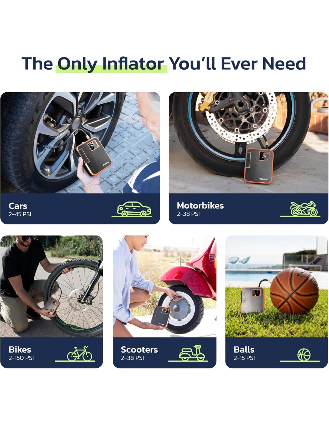 - Fino a 150 PSI, come gonfiatore per pneumatici, DP3 può gonfiare pneumatici per bici da pista con adattatore per valvola Schreder Presta come pompa per bici elettrica, indipendentemente dalle sue dimensioni compatte e dal peso leggero