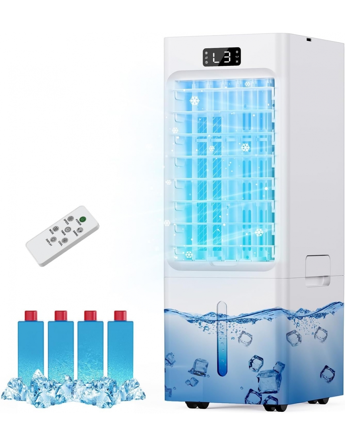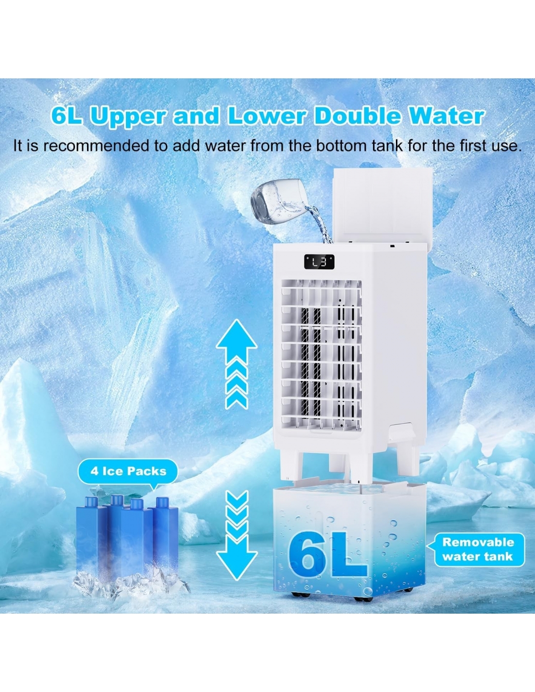- Questo condizionatore d'aria portatile adotta un design a doppio serbatoio d'acqua. Il serbatoio d'acqua superiore può essere aperto con il coperchio per aggiungere acqua, mentre il serbatoio d'acqua inferiore è rimovibile per una facile pulizia. Il serbatoio d'acqua da 6 litri è dotato di 4 contenitori per il ghiaccio, che possono fornire un flusso d'aria fresca a lungo termine senza frequenti aggiunte di acqua. In modalità di raffreddamento, può anche aumentare l'umidità interna.