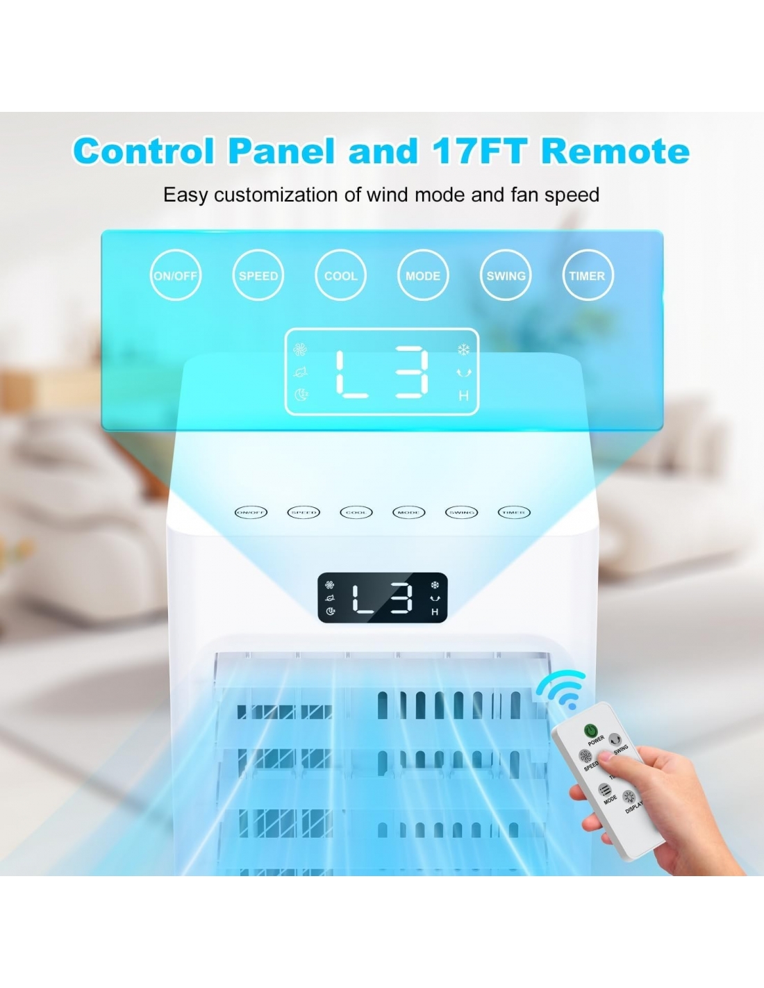 - Il condizionatore portatile può essere facilmente controllato tramite il pannello di controllo superiore o il telecomando (fino a 5 metri di distanza). Il design del display frontale consente di controllare facilmente lo stato operativo del dispositivo. È possibile spegnere il display premendo a lungo il pulsante della ventola o premendo brevemente il pulsante del display del telecomando, evitando così interferenze luminose durante la notte.