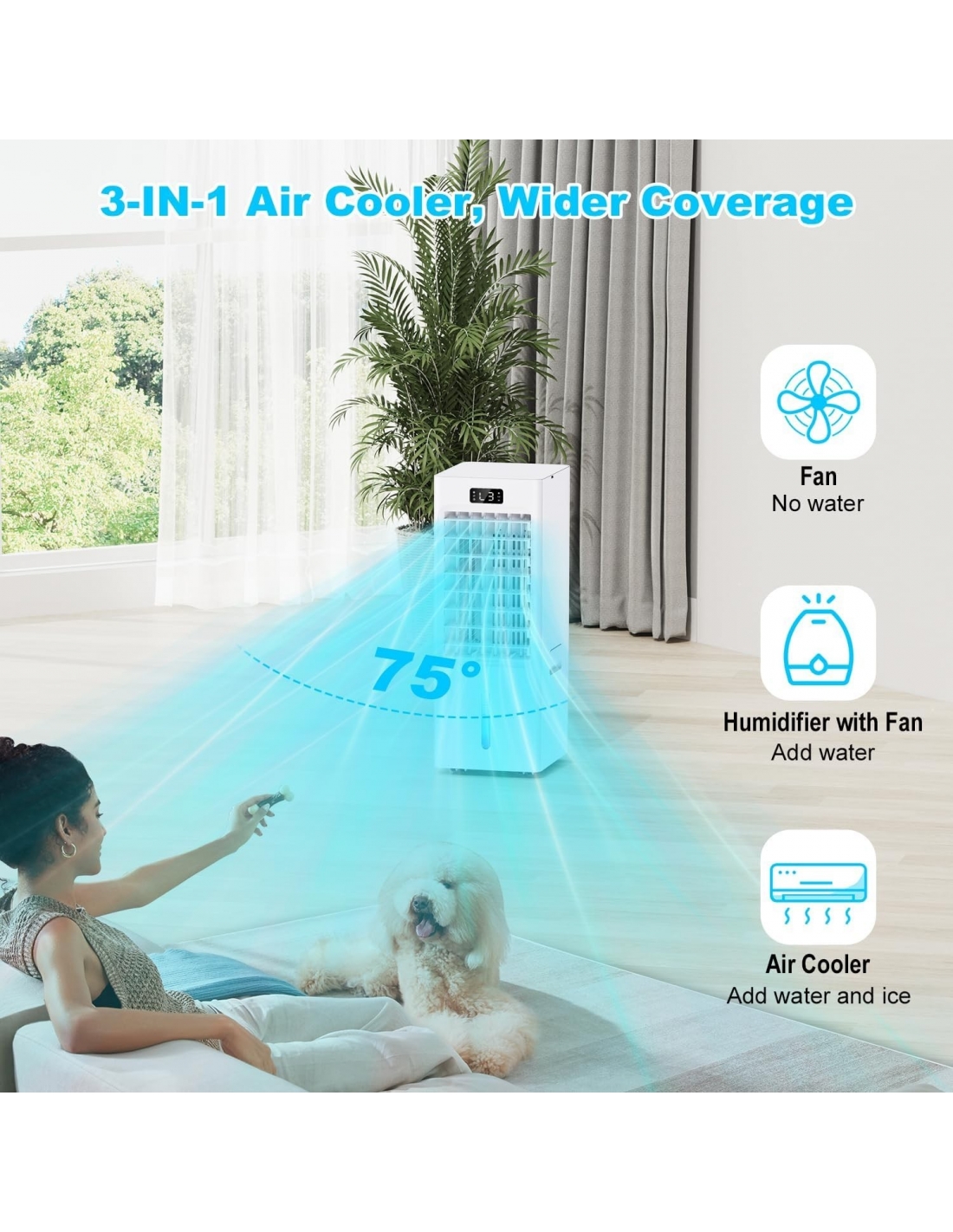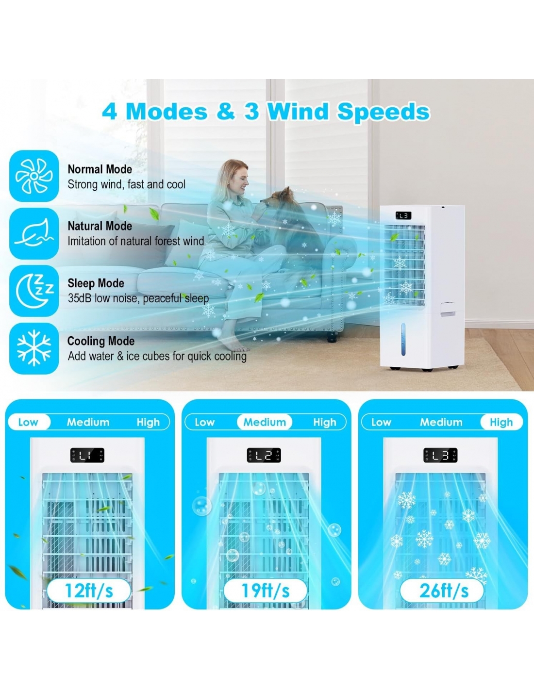 - Il nostro condizionatore d'aria portatile offre 4 modalità: Freddo, Sonno, Normale e Natura, consentendoti di godere di un'esperienza di raffreddamento personalizzata. Personalizza il flusso d'aria di raffreddamento con 3 velocità del vento (Basso 3,7 m/s, Medio 5,8 m/s, Alto 8,1 m/s) per goderti un'estate fresca e confortevole. Questo condizionatore d'aria portatile è perfetto per stanze, soggiorni, camere da letto, uffici.