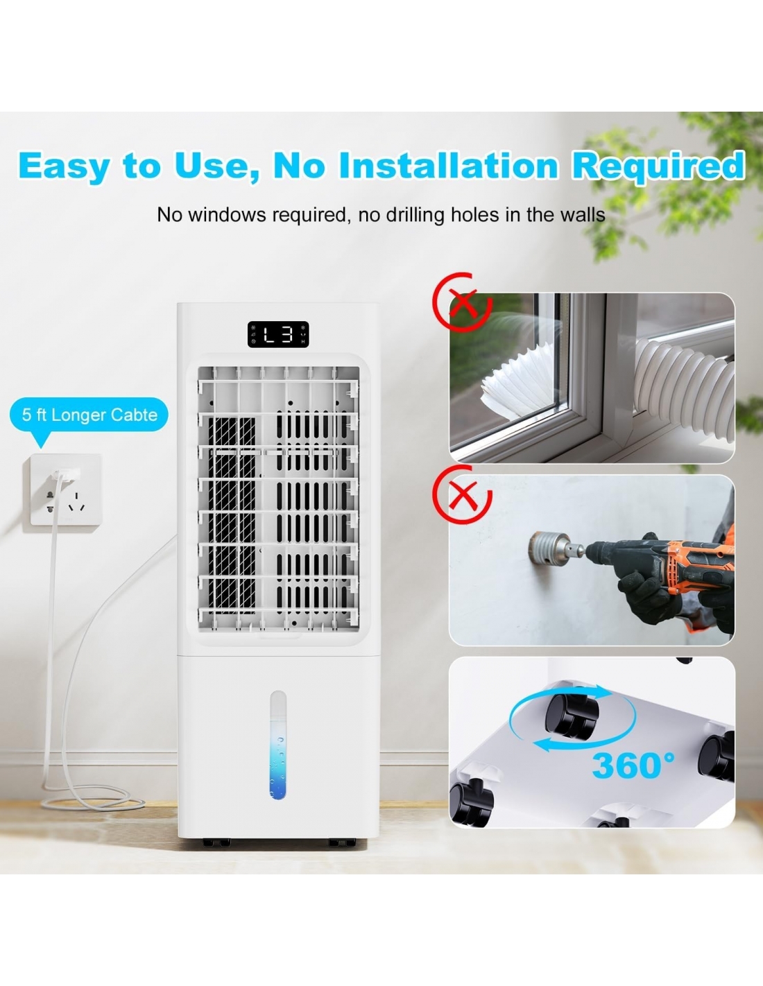 - Questo condizionatore d'aria portatile può realizzare una funzione di temporizzazione da 1 a 12 ore, adatta per l'uso durante il sonno. Al termine del tempo, il dispositivo si spegnerà automaticamente. Il condizionatore d'aria portatile è dotato di una maniglia portatile integrata per salire e scendere facilmente le scale. 4 ruote universali per un facile spostamento tra le stanze. Il dispositivo non richiede installazione, finestre o tubi flessibili.