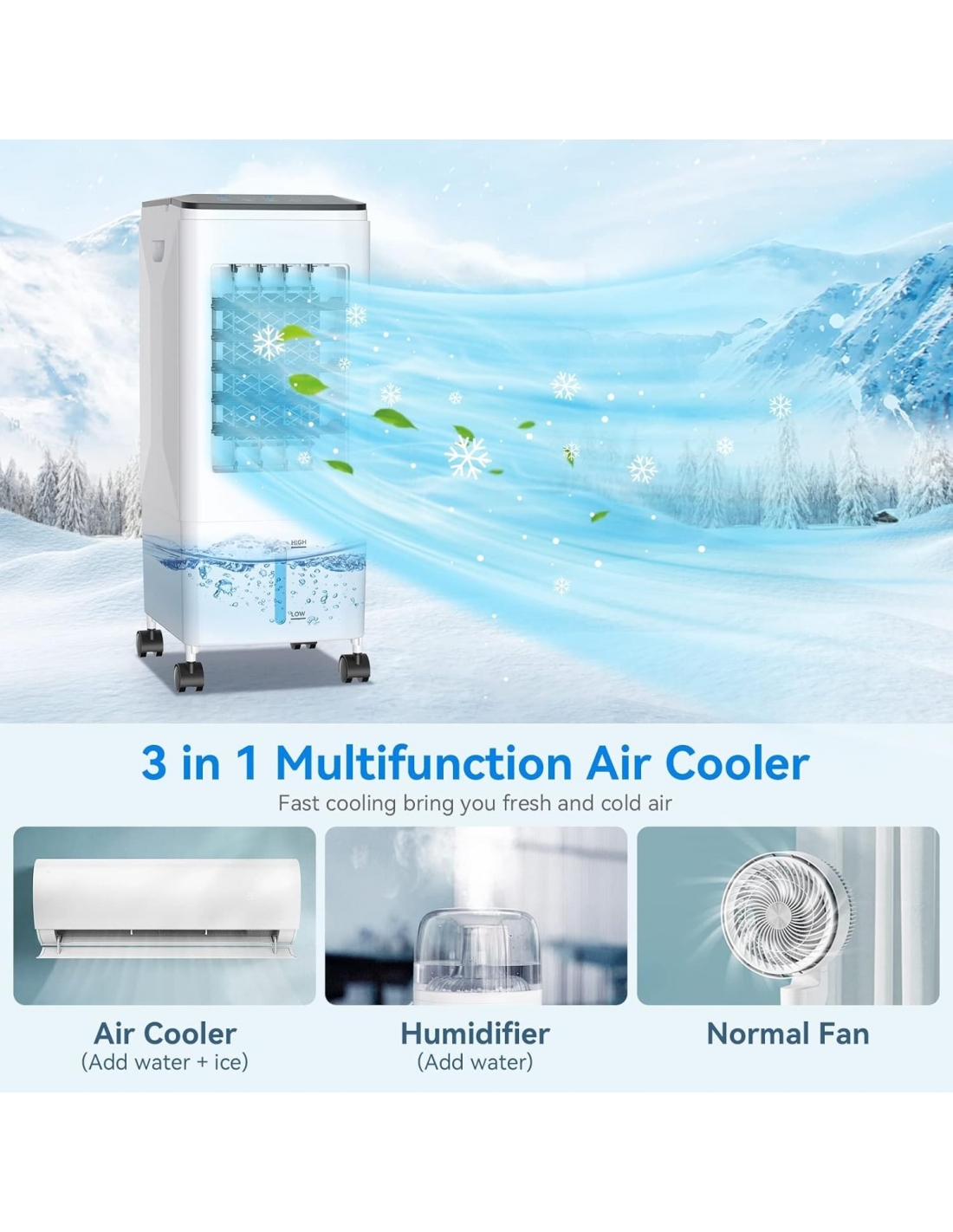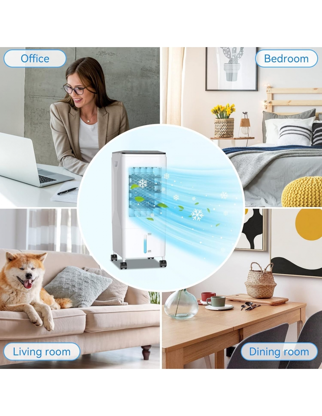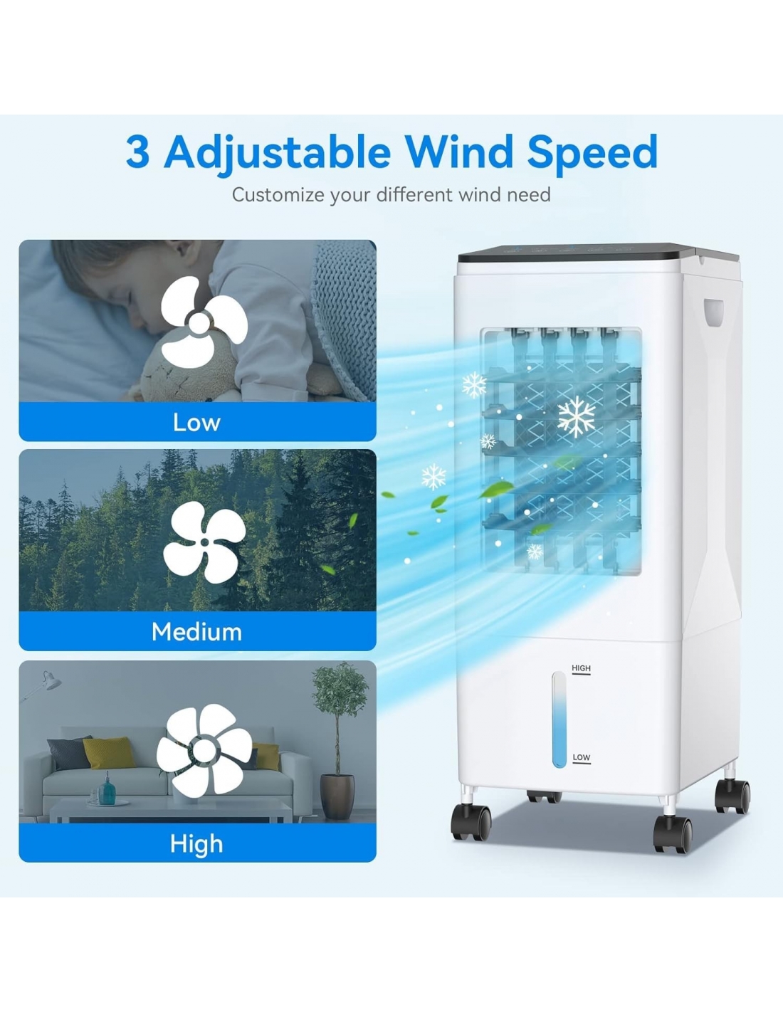 - Questo condizionatore d'aria portatile adotta un design a doppio serbatoio d'acqua. Il serbatoio d'acqua superiore può essere aperto con il coperchio per aggiungere acqua, mentre il serbatoio d'acqua inferiore è rimovibile per una facile pulizia. Il serbatoio d'acqua da 6 litri è dotato di 4 contenitori per il ghiaccio, che possono fornire un flusso d'aria fresca a lungo termine senza frequenti aggiunte di acqua. In modalità di raffreddamento, può anche aumentare l'umidità interna.