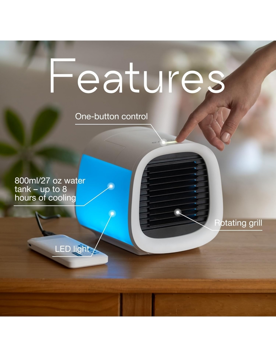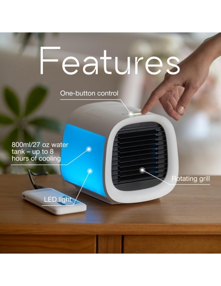 - 3-IN-1 RAFFREDDAMENTO – Raffredda e umidifica l'aria ovunque con il nostro condizionatore portatile evaCHILL. Grazie alla tecnologia evaporativa, il dispositivo non ha bisogno di un tubo e cattura le particelle di polvere per purificare l'aria. La comoda maniglia rende il raffrescatore super portatile, e le 4 velocità del mini condizionatore e il controllo a un solo pulsante lo rendono facile da usare.
