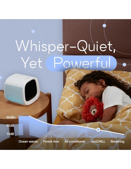 - PORTATILE – Il mini condizionatore d'aria evaCHILL è portatile e silenzioso (fino a 50bB) e può essere alimentato tramite USB da power bank, laptop e una presa di corrente dell'auto con una capacità di almeno 2A 5V. Non è necessaria alcuna installazione, quindi puoi muoverti con comfort e sentire la brezza dell'oceano ovunque tu vada, che tu sia in viaggio, al lavoro, a studiare o semplicemente a rilassarti a casa.