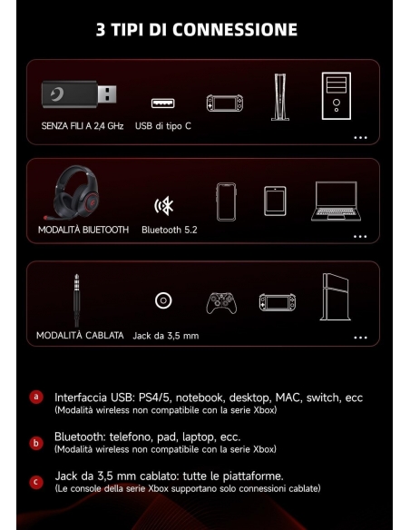 - Tre modalità di connessione per cuffie: le cuffie da gioco wireless con microfono possono essere collegate tramite il ricevitore da 2,4 GHz a PC, interruttore, PS4 e PS5. Facendo doppio clic sull'interruttore di alimentazione, può essere convertito in un auricolare Bluetooth da gaming, compatibile con telefoni, tablet e altri dispositivi mobili. Con il cavo audio da 3,5 mm, puoi giocare alla serie Xbox con queste cuffie da gioco. (Nella modalità cablata, il dispositivo deve essere spento.)