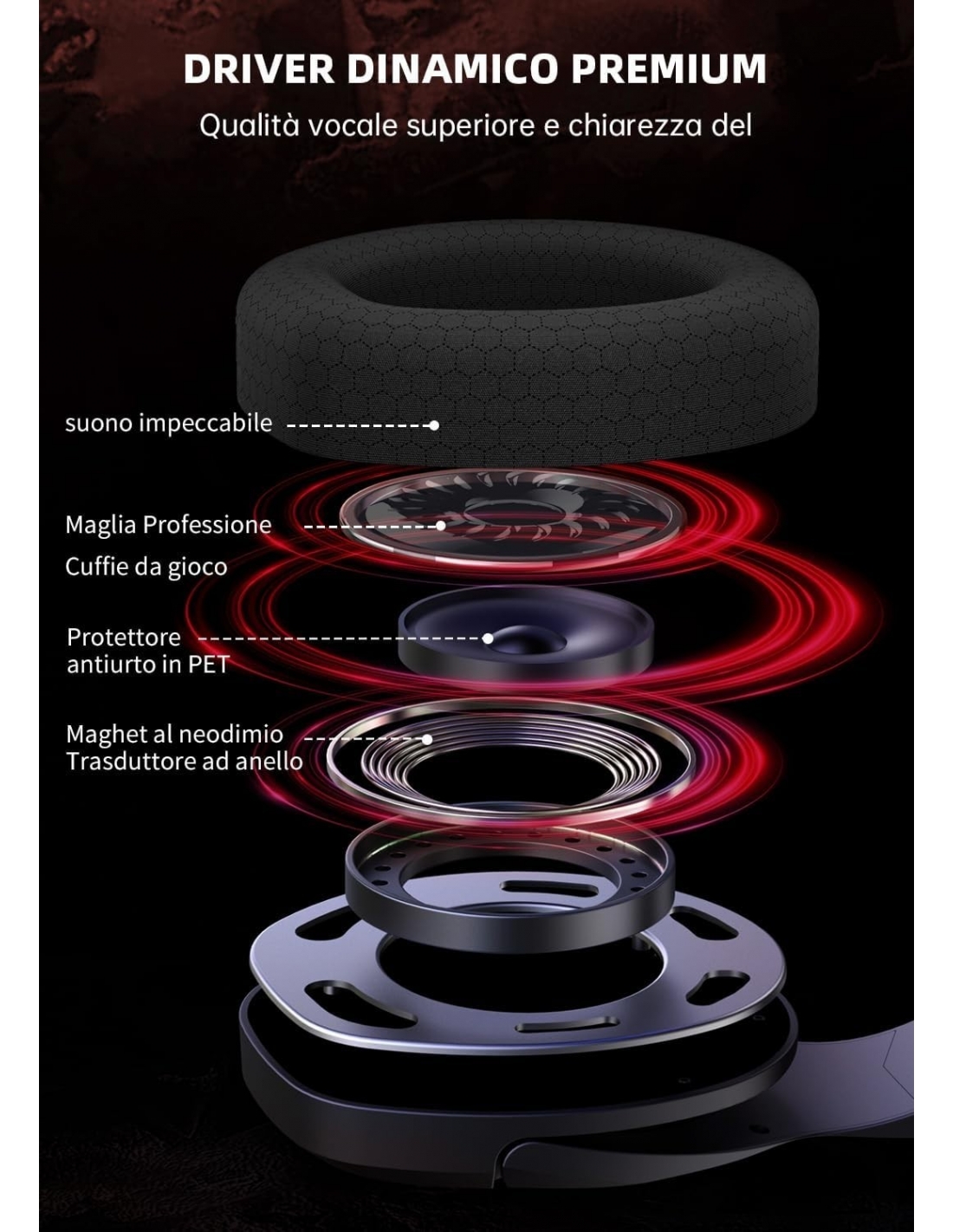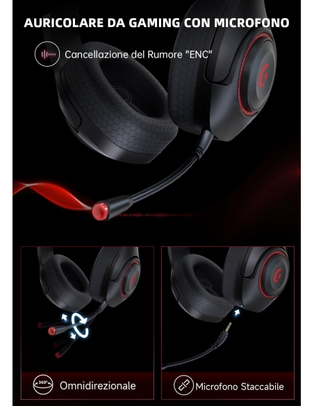 - Microfono rimovibile con cancellazione del rumore: queste cuffie da gaming per PC dispongono di un microfono omnidirezionale che può eliminare i rumori ambientali e quindi offre una buona qualità del suono. Il braccio del microfono delle cuffie wireless gaming over ear è realizzato in materiale flessibile e può essere spostato o rimosso facilmente quando non in uso. Quando il microfono è acceso, si accende un indicatore blu.