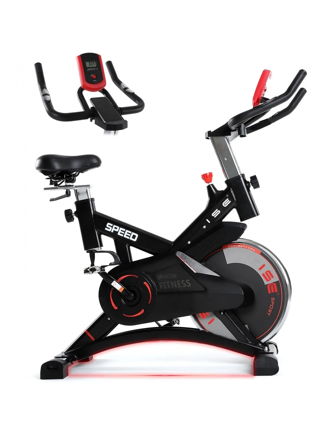 - ISE Bicicletta Cyclette Indoor con Volano 13 Kg e Resistenza Regolabile, Bici da Fitness Ergonomica con Sensore di Impulso, Porta Celullare, Ruote di Trasporto, Max 120Kg.