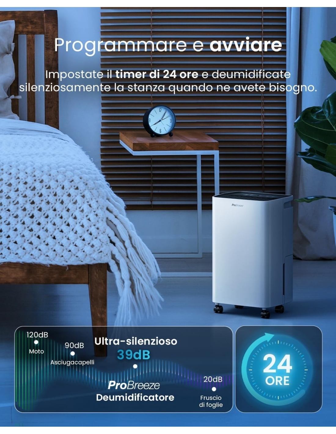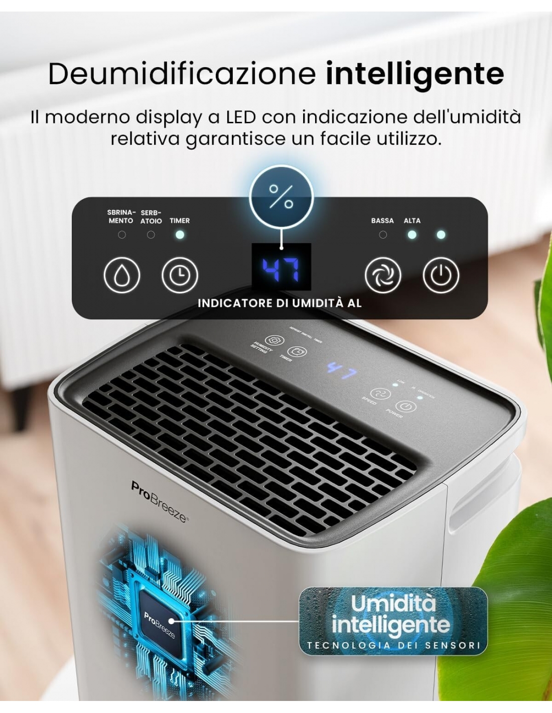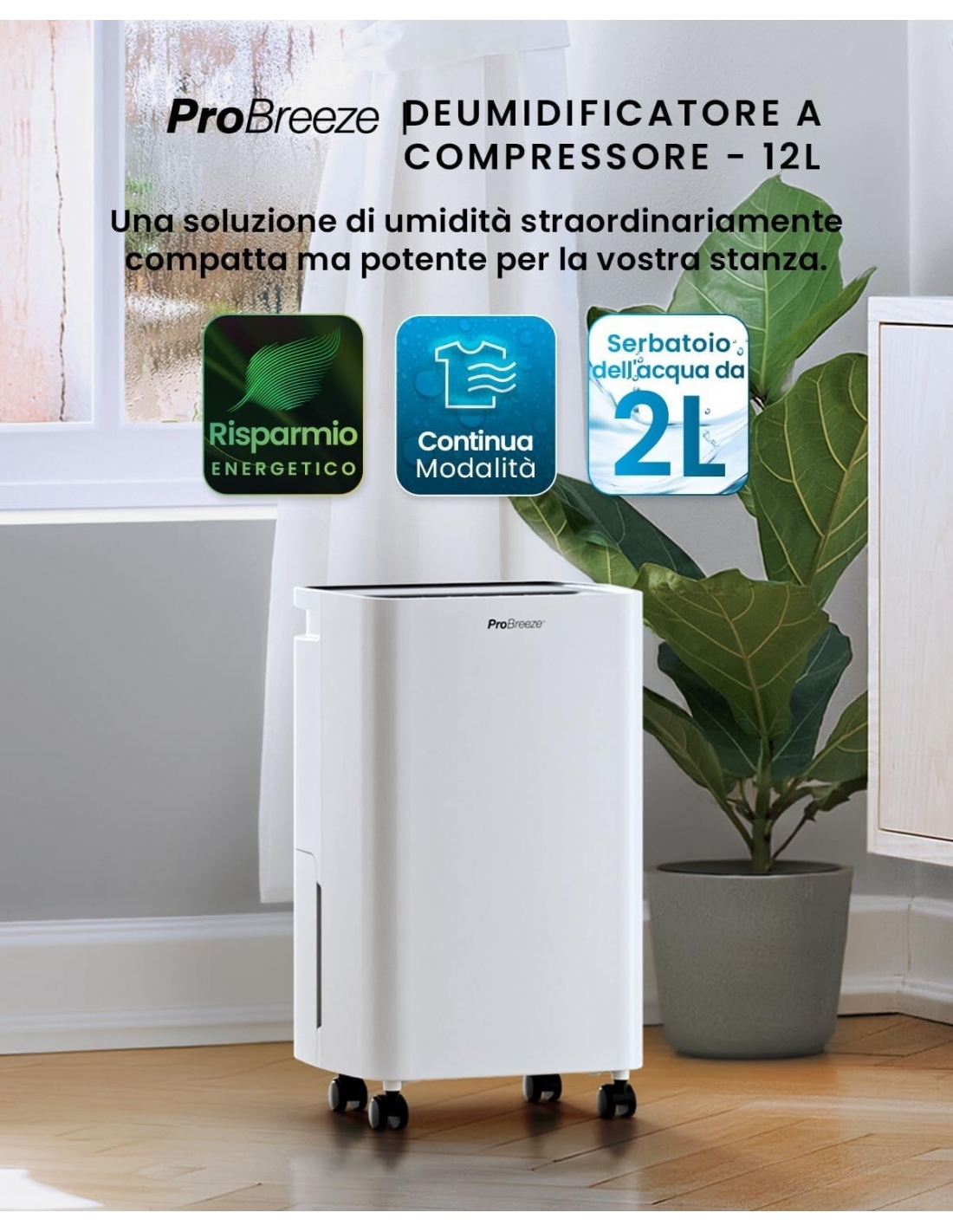 - BASSO CONSUMO ENERGETICO: Il deumidificatore a risparmio energetico da 6 litri/giorno di Pro Breeze è dotato di un potente compressore, un timer di accensione/spegnimento 24 ore su 24 e un sistema di spegnimento automatico per il risparmio energetico, aiutandoti a ridurre le fatture energetiche. È ideale per combattere umidità, muffa nera, condensa e umidità nelle abitazioni, con costi di gestione di soli 4,5 centesimi di euro all'ora.