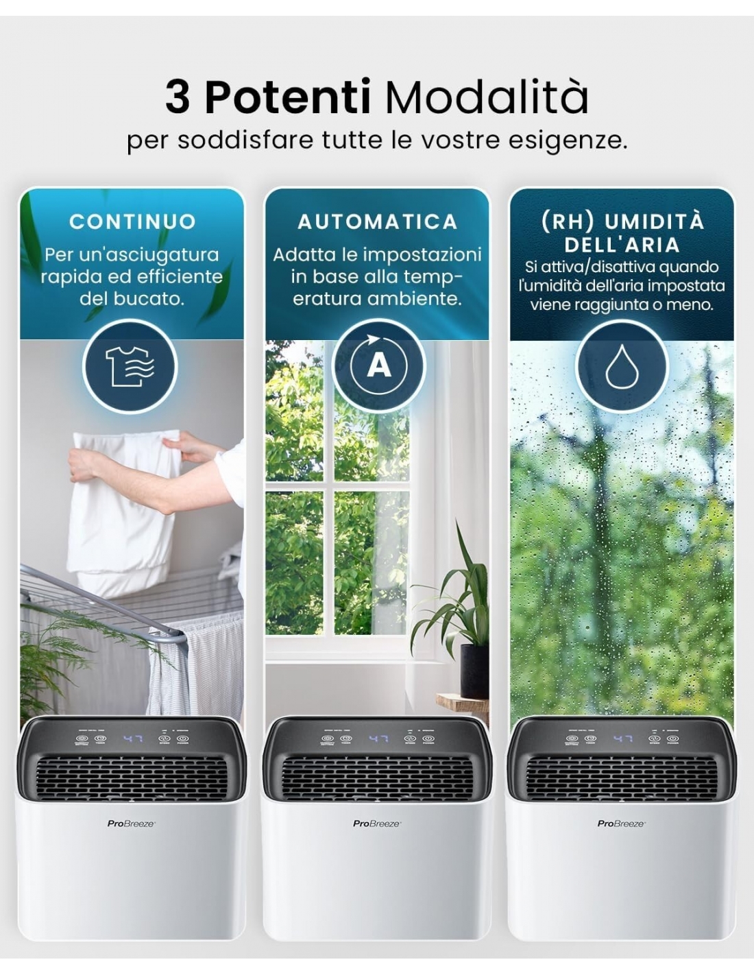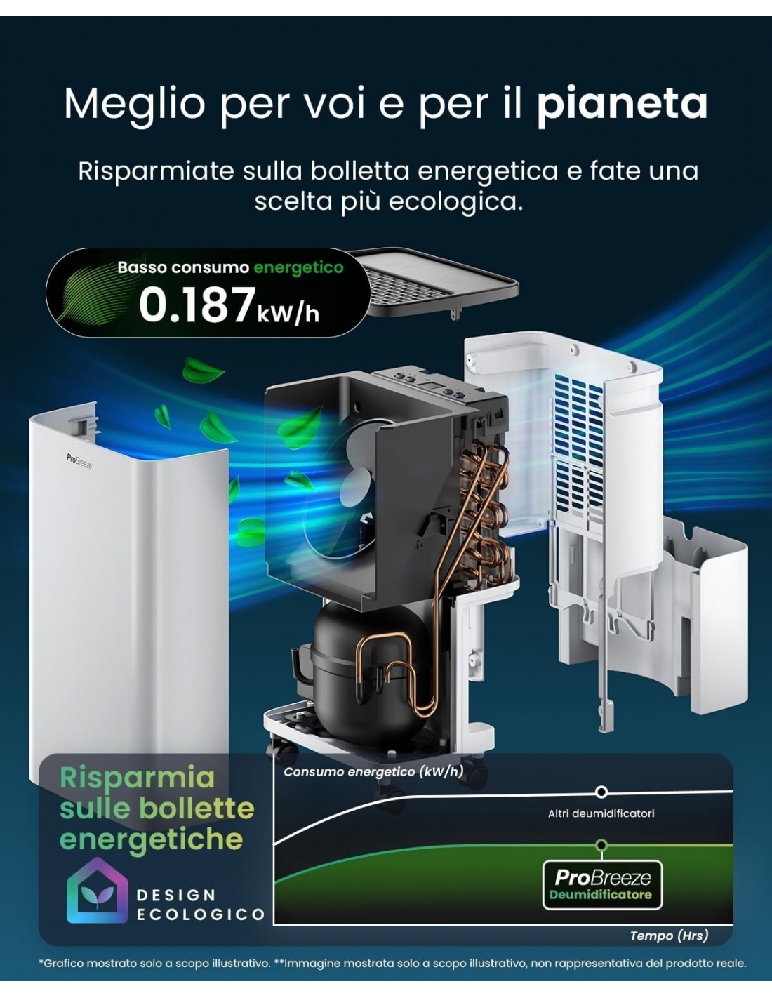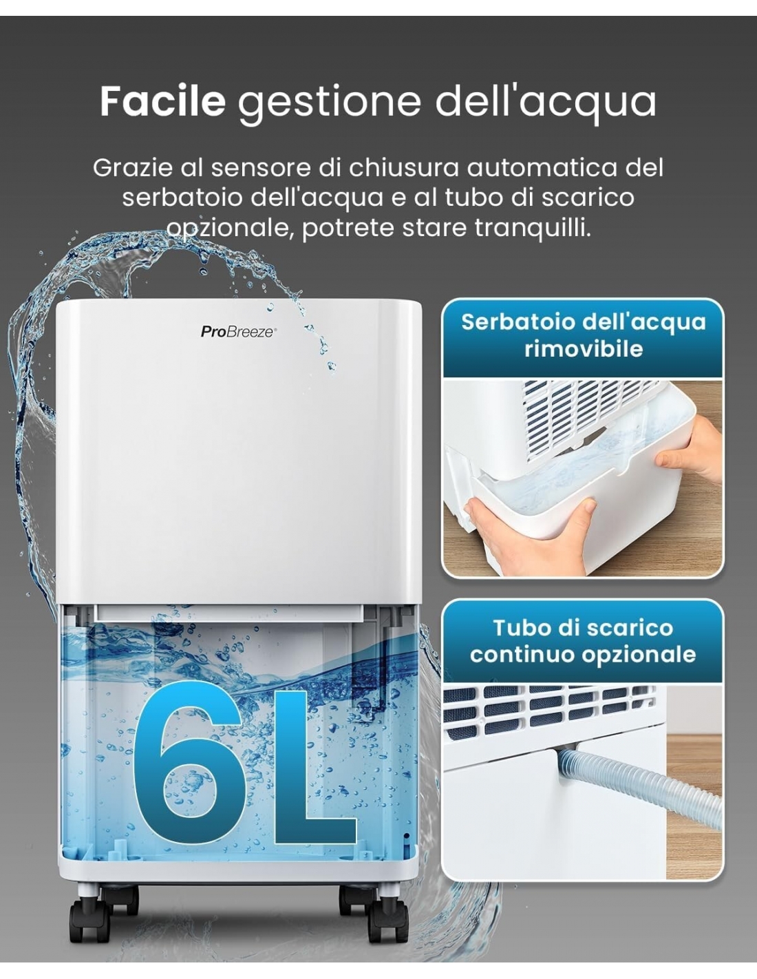 - BASSO CONSUMO ENERGETICO: Il deumidificatore a risparmio energetico da 6 litri/giorno di Pro Breeze è dotato di un potente compressore, un timer di accensione/spegnimento 24 ore su 24 e un sistema di spegnimento automatico per il risparmio energetico, aiutandoti a ridurre le fatture energetiche. È ideale per combattere umidità, muffa nera, condensa e umidità nelle abitazioni, con costi di gestione di soli 4,5 centesimi di euro all'ora.