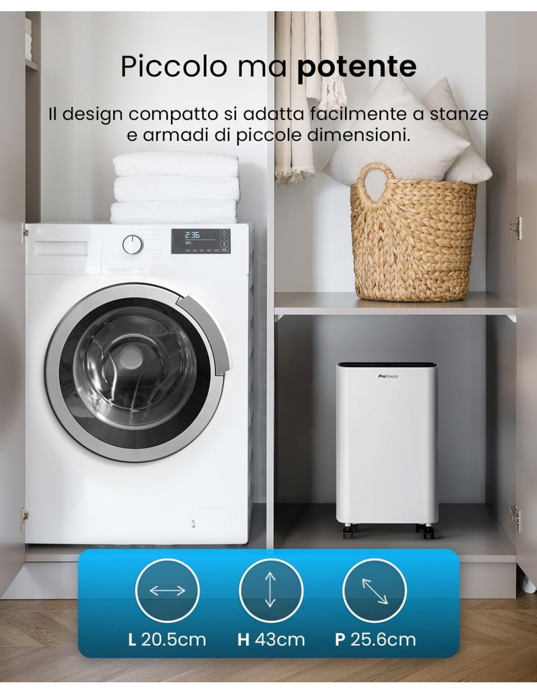 - DEUMIDIFICATORE PER INTERNI E PORTATILE: Questo deumidificatore è perfetto per la camera da letto o l'ufficio. È compatto, più piccolo di un microonde, e dotato di 4 rotelle per un facile trasporto in diverse stanze e spazi ristretti.