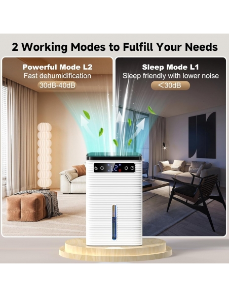 - 2 modalità di deumidificazione: la modalità potente (L2) rimuove rapidamente l'umidità. La modalità sonno (L1) funziona in modo ultra silenzioso (< 30dB), senza luce parassita, creando un ambiente tranquillo per un riposo ininterrotto. Passa da una modalità all'altra con una semplice pressione