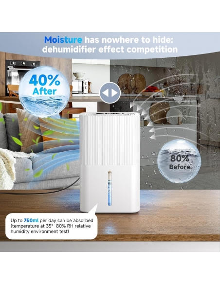 - Tecnologia migliorata e deumidificazione efficiente: che è molto più efficiente rispetto ad altri deumidificatori di piccole e medie dimensioni. Il nostro deumidificatore elettrico utilizza una tecnologia di deumidificazione avanzata, può assorbire fino a 450 ml di umidità al giorno (ambiente di funzionamento: 30 °C, 80% RH). Ideale per bagno, cucina, camera da letto e roulotte, ecc.