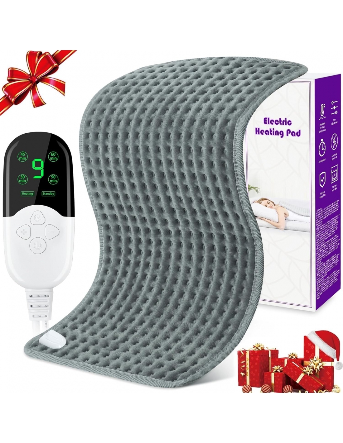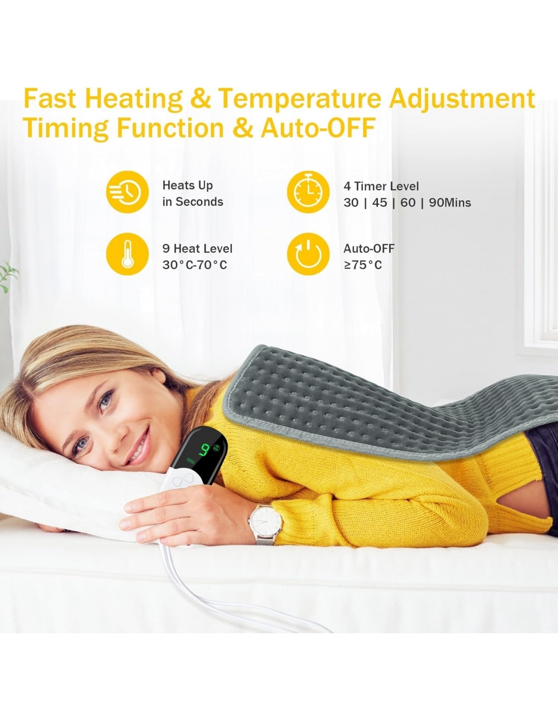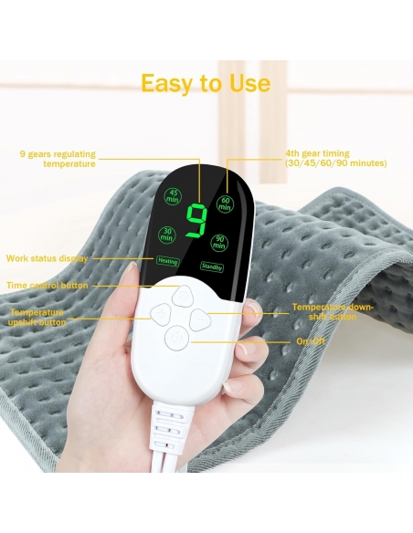 - Funzione 4 timer e spegnimento automatico: Puoi impostare il tempo di spegnimento su 30 minuti | 45 minuti | 60 minuti | 90 minuti in base alle tue esigenze, per evitare di sprecare elettricità. Quando la temperatura di riscaldamento supera i 75°C, il cuscino termico si spegne automaticamente per evitare ustioni da surriscaldamento, garantendo la sicurezza d'uso