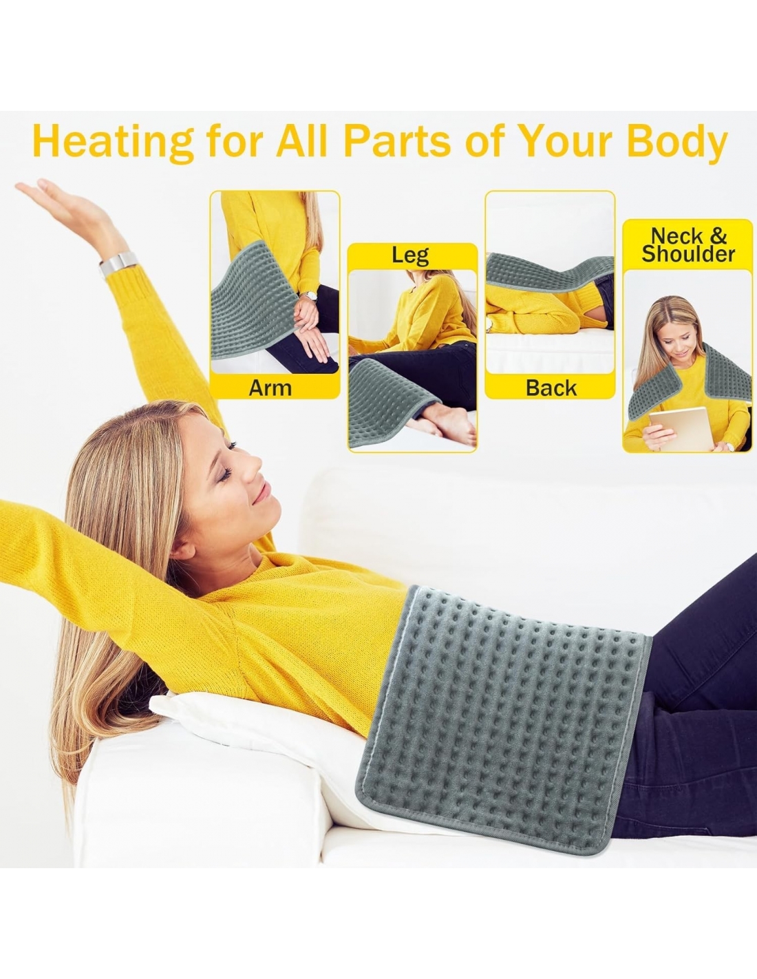 - Mantieni tutto il corpo rilassato: Il nostro termoforo elettrico è adatto a diverse parti del corpo: schiena, spalle, collo, addome (periodo mestruale), braccia, gambe, ginocchia, mani (sindrome di Raynaud), piedi, muscoli, articolazioni, ecc., che aiutano a promuovere la circolazione sanguigna e a dire addio agli arti rigidi in inverno. Suggerimenti: NON usare il termoforo come cuscino per sedersi